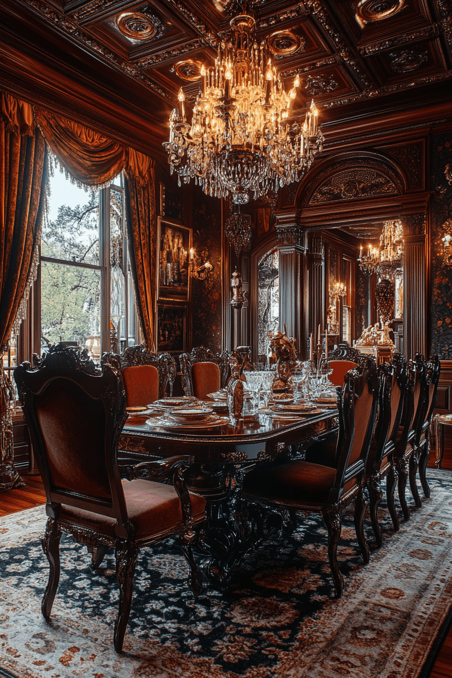 Lavish Victorian elegance transforms antique dining rooms into dramatic gathering spaces filled with timeless beauty. Carved mahogany furniture and patterned textiles layer the room with rich texture and visual depth. Crystal chandeliers scatter warm light across carefully arranged place settings. Ornate sideboards and vintage artwork add personality and historic storytelling. Elegant details make these antique dining rooms both grand and welcoming for memorable dinners. Discover the magic of Victorian antique dining rooms and elevate your entertaining space today!