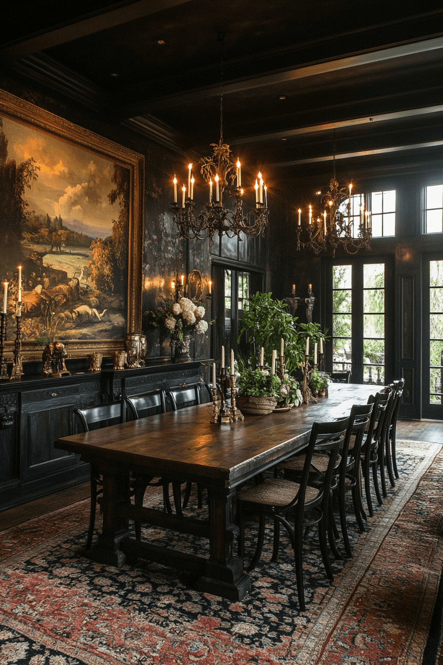 Historic drama fills antique dining rooms influenced by Gothic Revival architecture. Dark wood furnishings and intricate carvings create bold visual impact. Layered fabrics and soft lighting add warmth to the dramatic setting. Architectural details bring depth and character throughout the space. Powerful design makes these antique dining rooms unforgettable places to gather. Discover Gothic antique dining rooms and design a dining area that feels striking and timeless today!