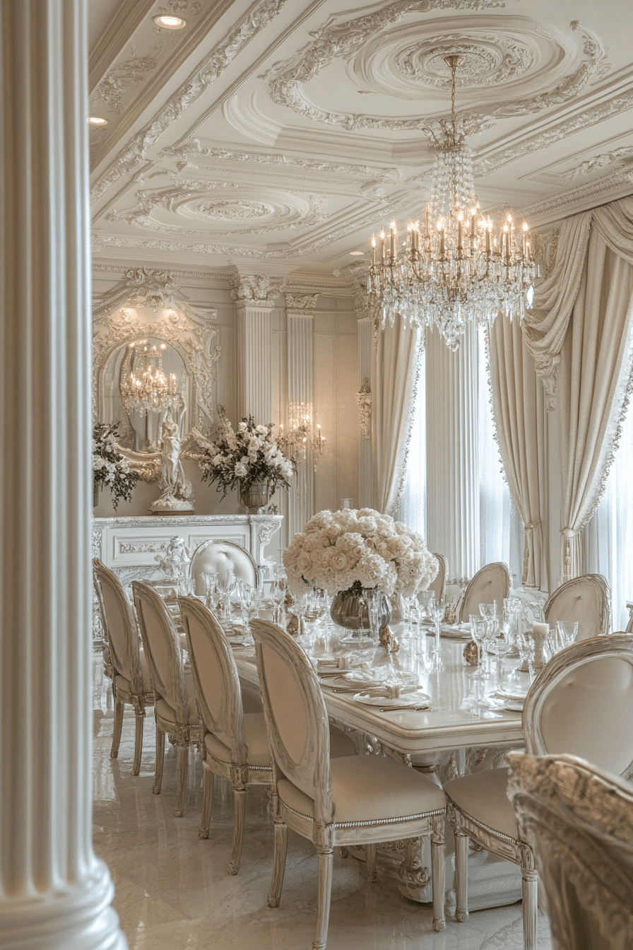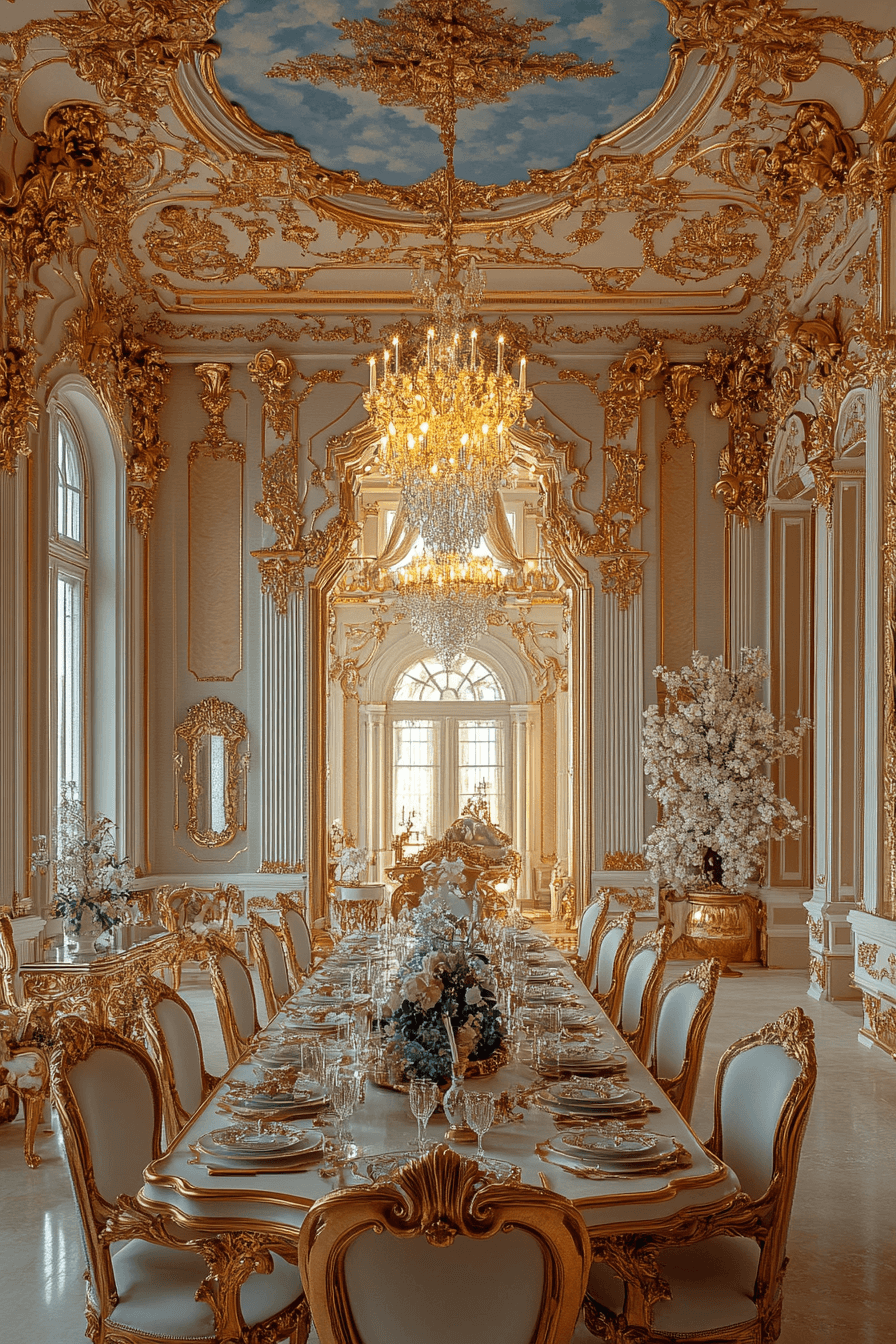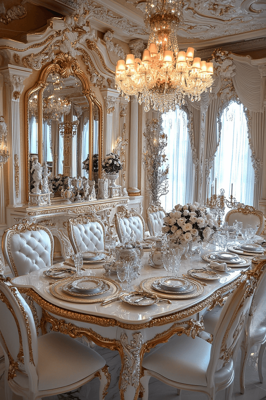 Playful elegance defines antique dining rooms influenced by Rococo style. Pastel tones and delicate ornamentation brighten the entire space. Curved furniture shapes introduce graceful movement throughout the room. Reflective accents scatter light and create sparkling charm. Cheerful atmosphere makes these antique dining rooms feel joyful and inviting. Discover Rococo antique dining rooms and bring whimsical elegance into your home today!
