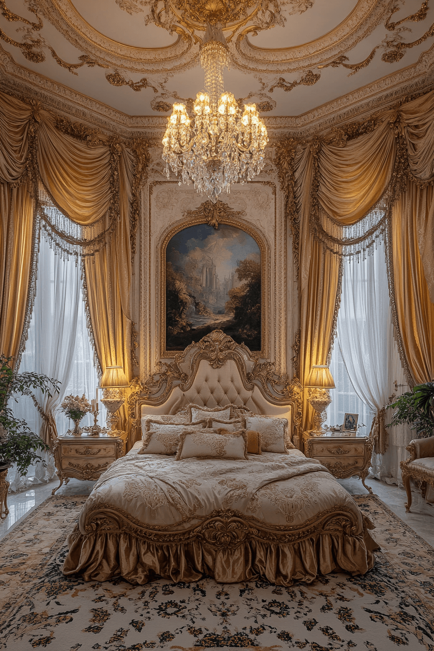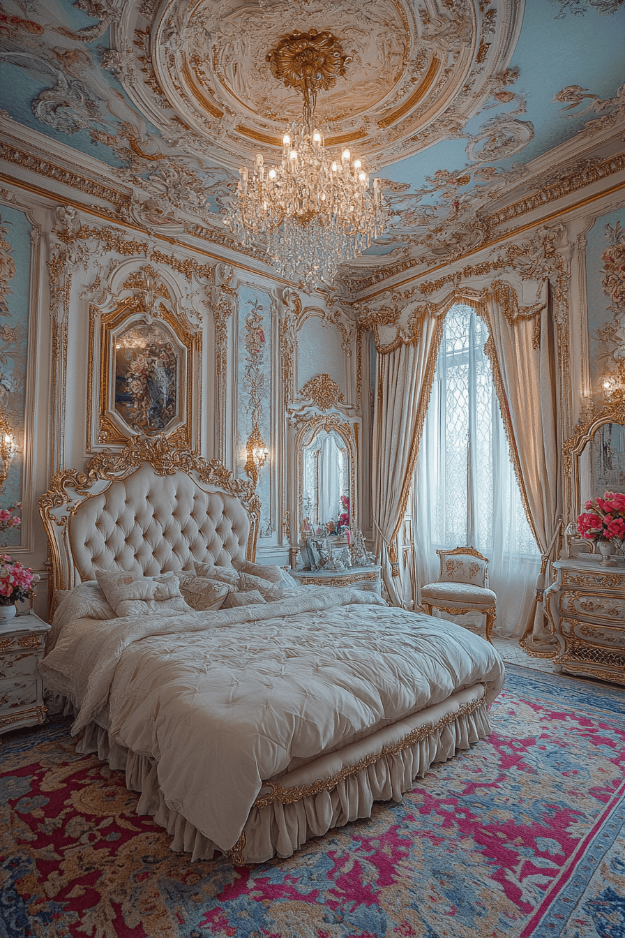 Rococo romance fills antique home decor ideas with graceful elegance and whimsical charm. Pastel palettes, ornate mirrors, and tufted bedding create dreamy interiors. Carved furniture and delicate chandeliers add vintage sophistication. Floral fabrics soften the overall design with romantic warmth. The result feels airy, elegant, and enchanting. Discover antique home decor ideas inspired by Rococo style that transform bedrooms into beautiful retreats!