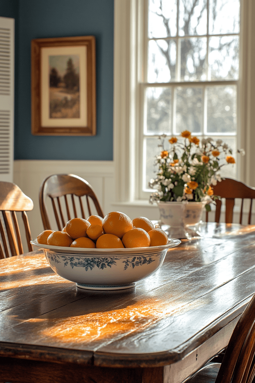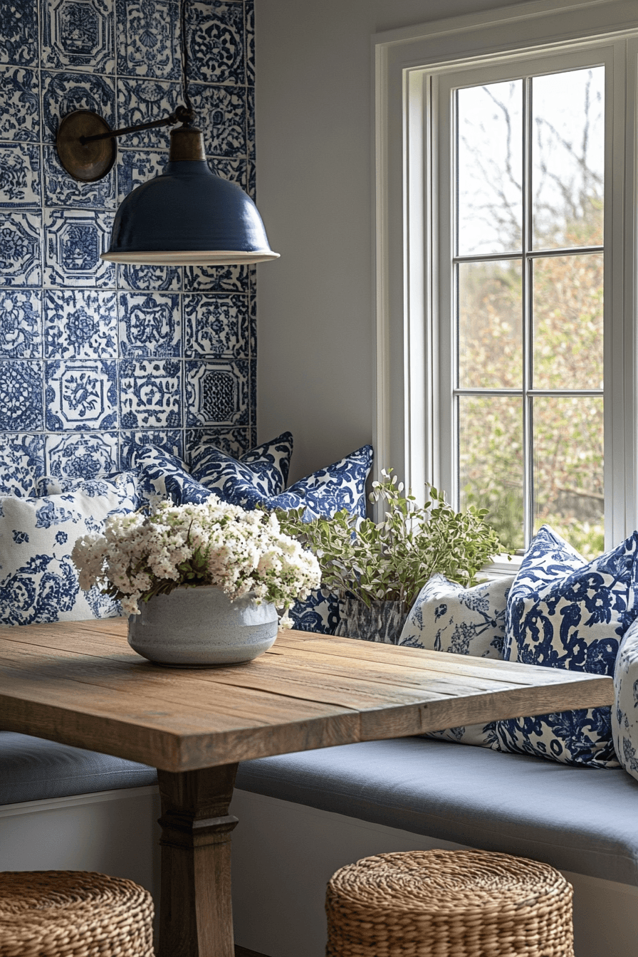 Dutch Colonial warmth shapes antique home decor ideas ideal for charming kitchen corners. Built-in benches, checkered textiles, and pendant lighting create a cozy breakfast nook. Delft-inspired tiles and vintage dishware add historic character. Soft blues and warm woods maintain balance in the space. Everyday meals feel comforting and intimate here. Discover antique home decor ideas that bring Dutch Colonial charm to your kitchen!