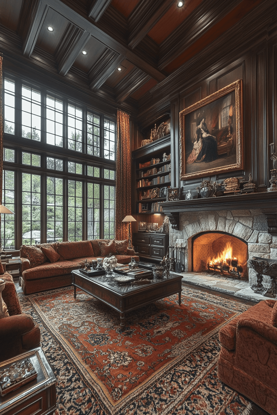 Tudor architecture inspires antique home decor ideas rich with dramatic texture and heritage. Exposed wood beams, carved fireplaces, and deep color palettes set a stately tone. Antique books and layered fabrics enhance the storytelling atmosphere. Wrought iron lighting and vintage accents reinforce the historic style. The overall aesthetic feels bold, elegant, and timeless. Explore antique home decor ideas inspired by Tudor interiors!