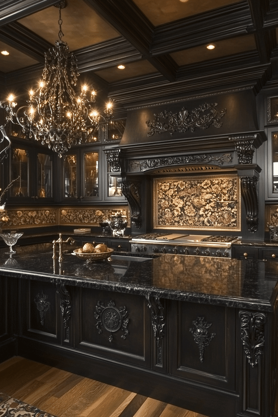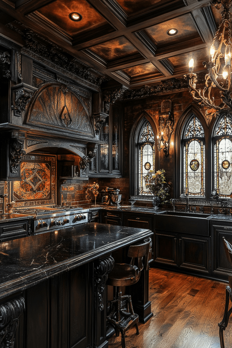 Gothic Revival influence enriches antique kitchen decor ideas with dramatic architectural beauty. Dark wood cabinetry, stained glass panels, and pointed arch details create striking character. Wrought iron fixtures and carved accents add historic intrigue. Jewel tones and stone textures deepen the atmosphere. The kitchen feels romantic and bold. Discover antique kitchen decor ideas inspired by Gothic interiors!