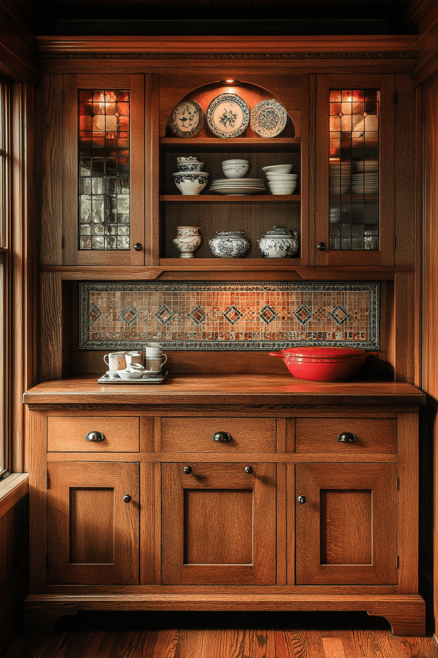 Craftsman influence grounds antique kitchen decor ideas in timeless workmanship and thoughtful detail. Solid oak cabinets, handcrafted tile backsplashes, and built-in seating showcase skilled craftsmanship. Earthy tones and subtle geometric patterns keep the design cohesive and calming. Mission-style lighting enhances the authentic look. Every element feels both functional and beautifully made. Discover antique kitchen decor ideas inspired by Arts and Crafts tradition!