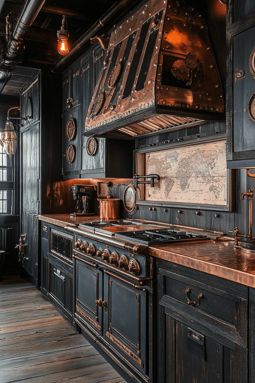 Steampunk imagination transforms antique kitchen decor ideas into inventive vintage spaces. Copper pipes, dark wood cabinets, and glowing Edison bulbs create a dramatic industrial atmosphere. Cabinet hardware shaped like gears adds playful mechanical detail. Decorative globes, antique maps, and leather accents reinforce the adventurous theme. The kitchen becomes a creative workshop full of personality. Discover antique kitchen decor ideas inspired by steampunk design!