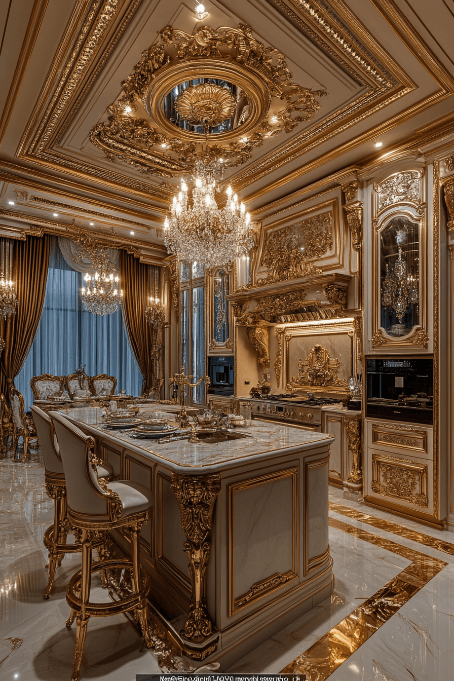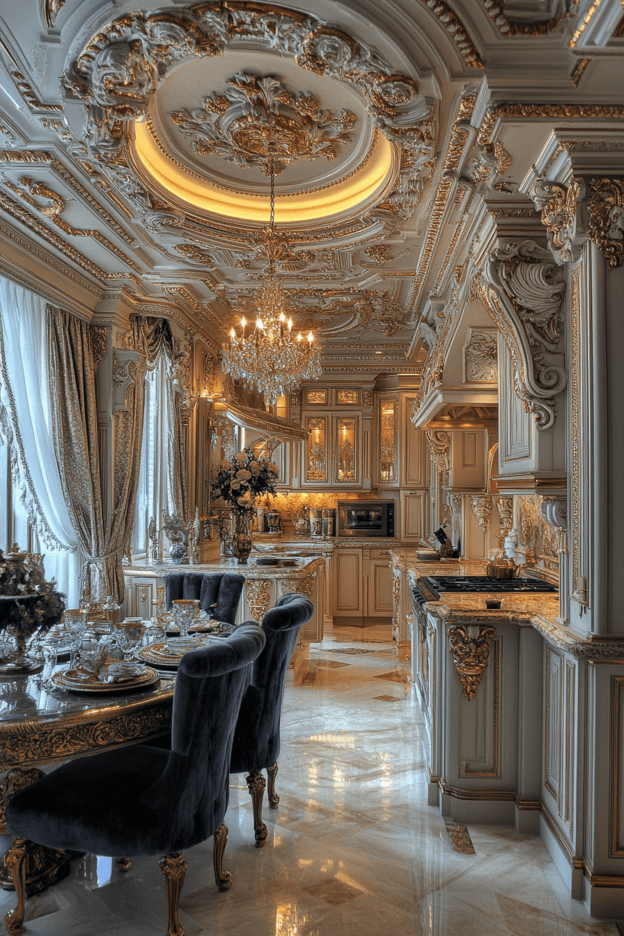 Gilded Age influence brings radiant glamour to antique kitchen decor ideas filled with vintage luxury. Marble surfaces, carved cabinetry, and ornate moldings create opulent character. Crystal chandeliers and plush seating elevate the space. Polished brass and mirrored finishes reflect warm light throughout the kitchen. The result feels grand yet welcoming. Explore antique kitchen decor ideas inspired by the Gilded Age!