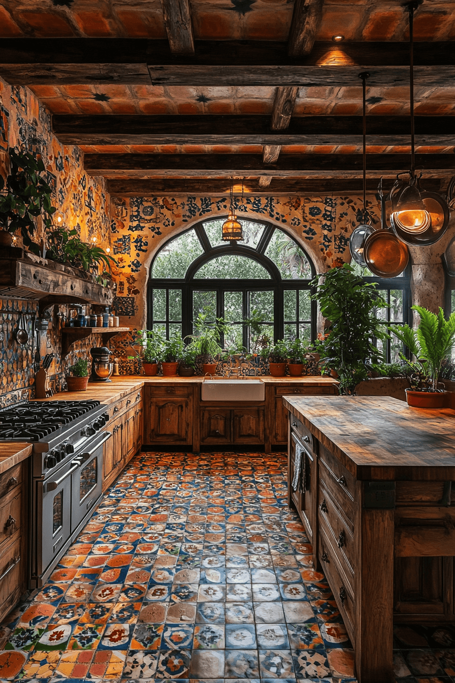 Southwestern energy fills antique kitchen decor ideas with earthy color and artisan texture. Terracotta floors, wooden beams, and tribal patterns add bold warmth. Open shelving highlights handmade pottery. Soft golden lighting enhances the welcoming feel. The kitchen feels vibrant and full of personality. Discover antique kitchen decor ideas inspired by Southwest design!