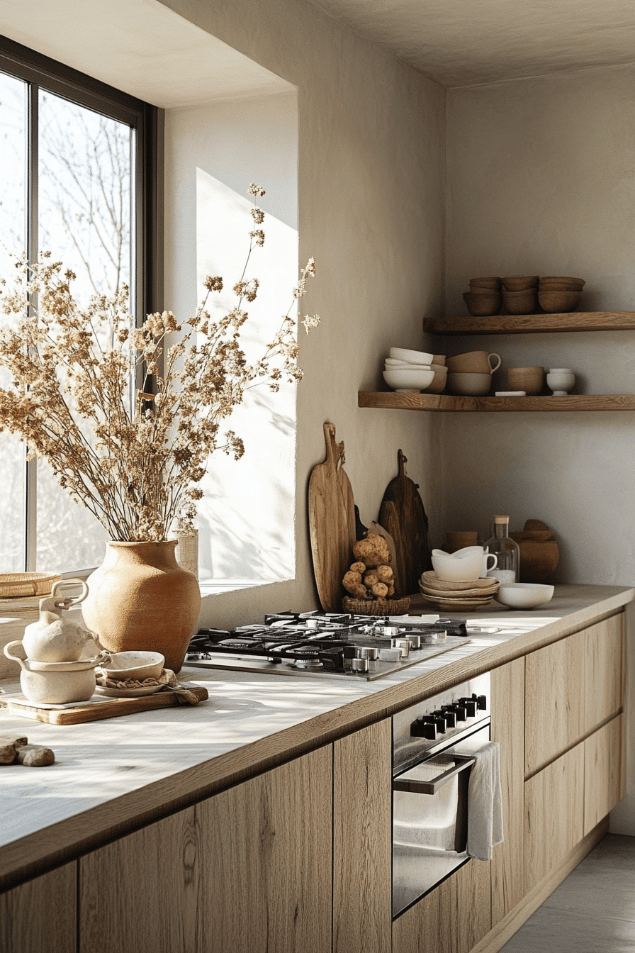 Nordic simplicity softens antique kitchen decor ideas with clean lines and airy calm. Pale wood cabinets and neutral tones brighten the room naturally. Simple shelving displays vintage dishware with elegance. Soft textiles introduce warmth without clutter. The design feels peaceful and balanced. Explore antique kitchen decor ideas inspired by Scandinavian style!