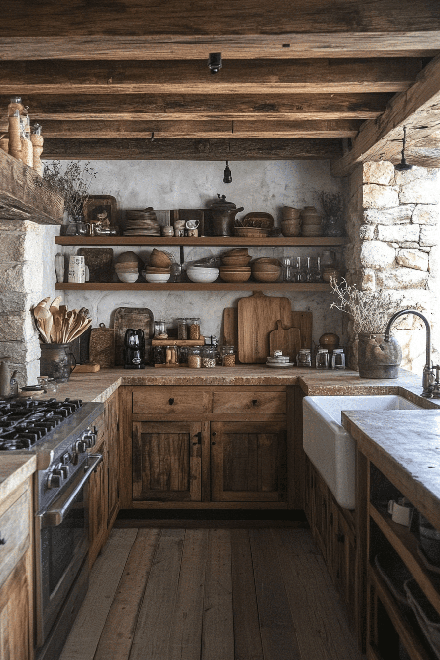 Farmhouse heritage shapes antique kitchen decor ideas that celebrate comfort, warmth, and rustic authenticity. Distressed cabinets, deep apron sinks, and classic cast iron cookware create a lived-in atmosphere that feels welcoming. Open shelving displays heirloom plates, mason jars, and woven linens that add history to the room. Wooden ceiling beams and enamel accents reinforce the nostalgic farmhouse feel. The combination of sturdy textures and cozy details invites people to gather. Discover antique kitchen decor ideas that bring heartfelt farmhouse charm into your home!