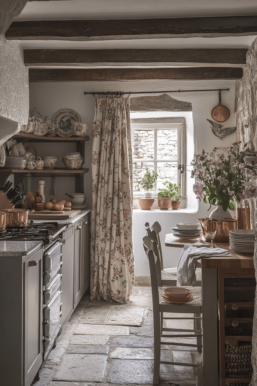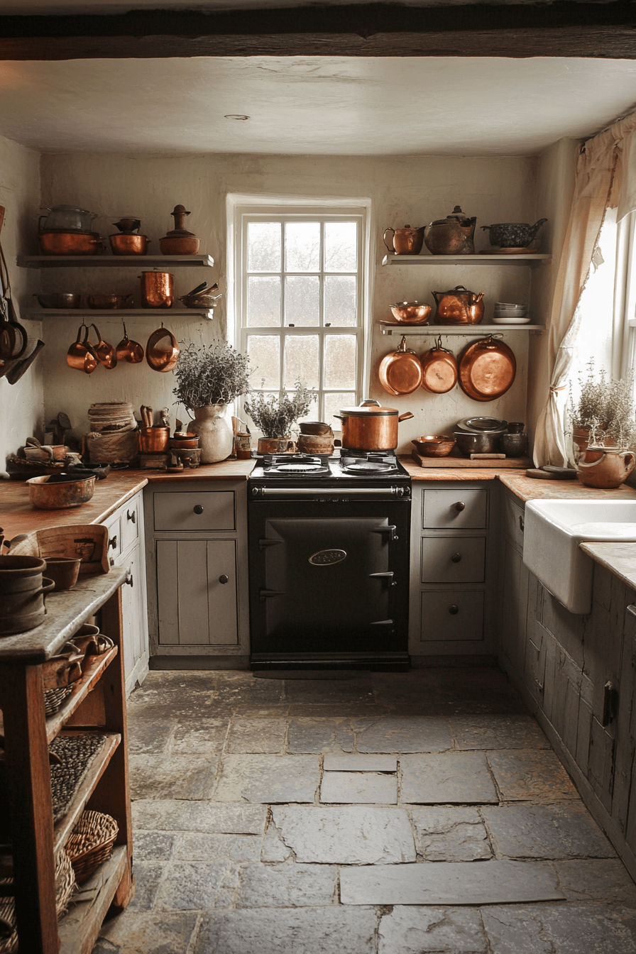 English cottage style sweetens antique kitchen decor ideas with cozy countryside charm. Painted cabinets, floral patterns, and delicate china displays create romantic warmth. Butler sinks and freestanding cupboards enhance the storybook character. Fresh flowers near sunny windows brighten the space naturally. The kitchen feels welcoming and lovingly lived-in. Discover antique kitchen decor ideas inspired by English cottage kitchens!
