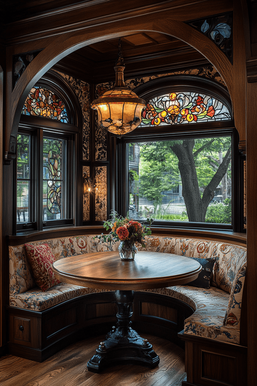 Art Nouveau artistry enriches antique kitchen decor ideas with flowing curves and botanical motifs. Curved cabinetry and stained glass accents create graceful movement. Soft pastel colors and floral tilework enhance the natural aesthetic. Decorative iron hardware adds artistic detail. The kitchen feels creative and elegant. Discover antique kitchen decor ideas inspired by Art Nouveau style!
