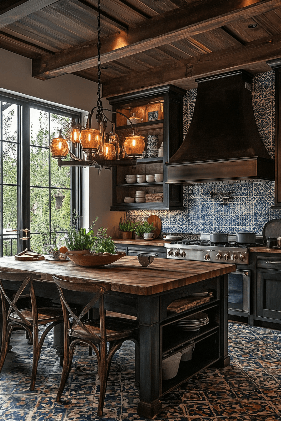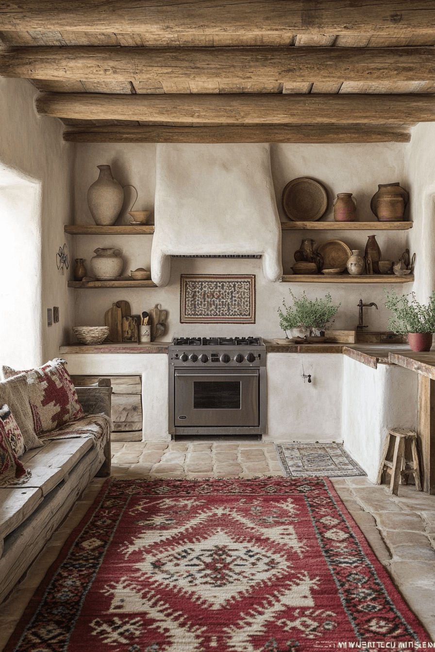 Bohemian flair fills antique kitchen decor ideas with colorful creativity and layered personality. Patterned tiles, woven rugs, and handmade ceramics create a lively visual mix. Open shelves display eclectic vintage finds and travel treasures. Antique furniture pieces blend effortlessly with artistic decor. The room feels expressive, welcoming, and full of life. Explore antique kitchen decor ideas inspired by bohemian style that celebrate individuality!
