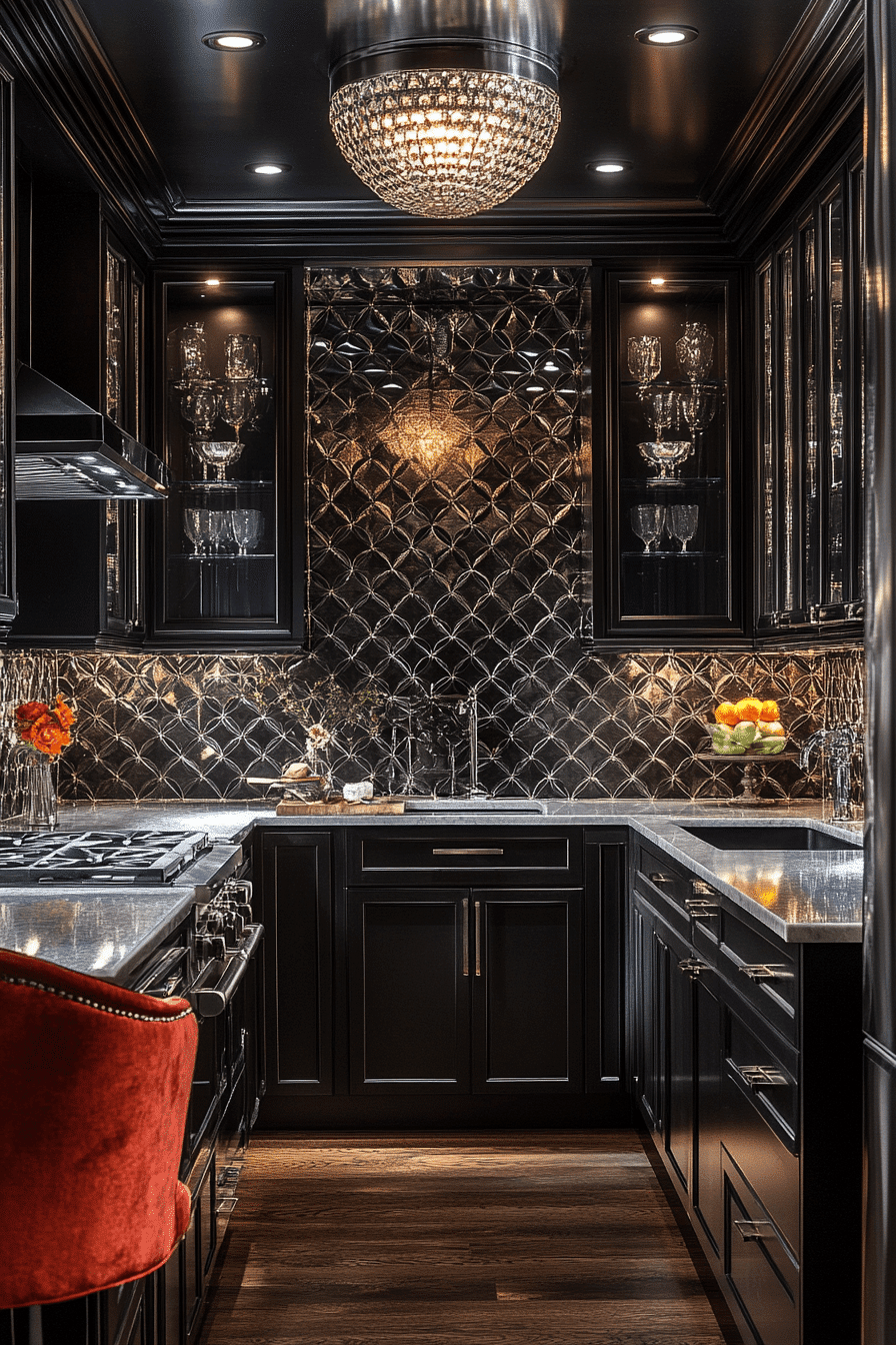 Art Deco glamour energizes antique kitchen decor ideas with striking shapes and vintage sparkle. Polished chrome hardware, mirrored cabinet accents, and marble surfaces reflect light throughout the space. Streamlined cabinetry and checkerboard flooring reinforce the bold retro aesthetic. Jewel-tone decor elements introduce vibrant personality and contrast. The entire kitchen feels sophisticated, dramatic, and stylishly nostalgic. Tap to explore antique kitchen decor ideas that showcase dazzling Art Deco flair!