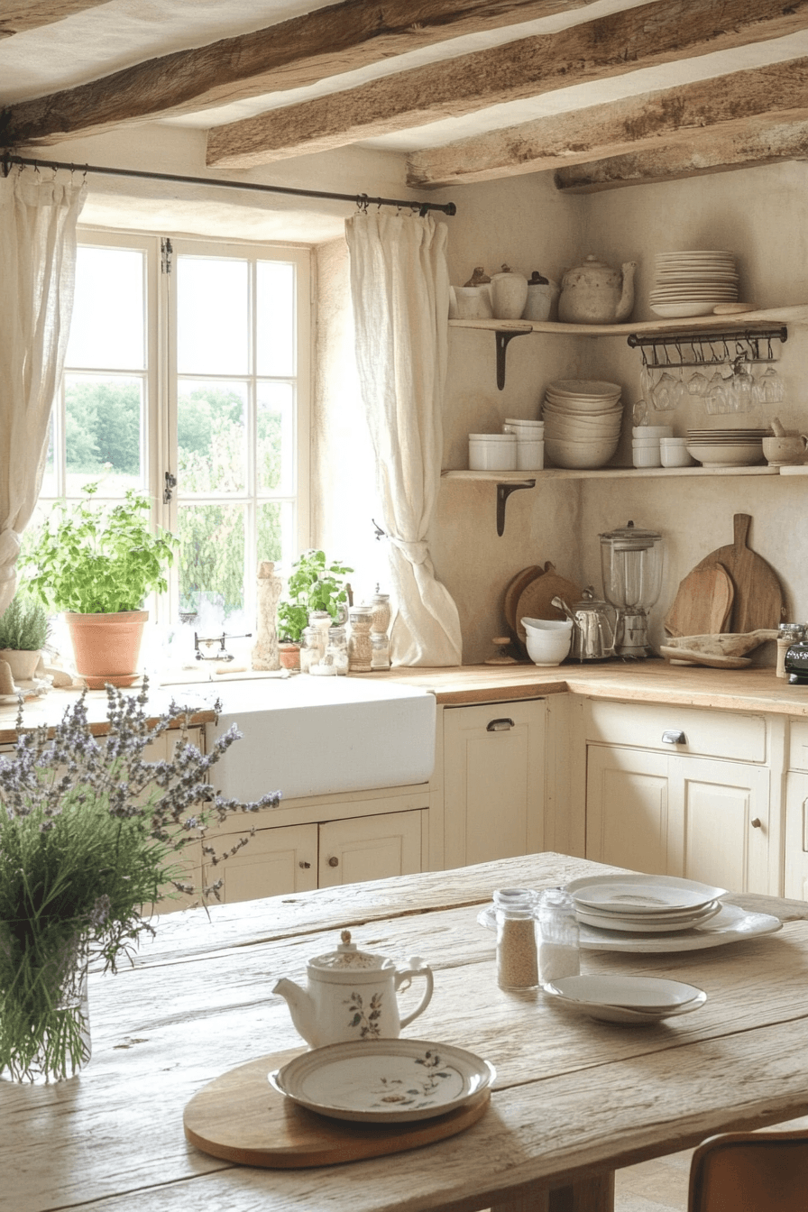 French provincial charm softens antique kitchen decor ideas with romantic countryside beauty. Pastel cabinets, distressed wood finishes, and delicate floral accents create a light and airy feel. Vintage dishware displayed on open shelving adds personality and warmth. Wrought iron lighting and natural stone flooring enhance rustic elegance. The space feels peaceful and welcoming for slow breakfasts or evening gatherings. Explore antique kitchen decor ideas that bring French country magic into your kitchen!