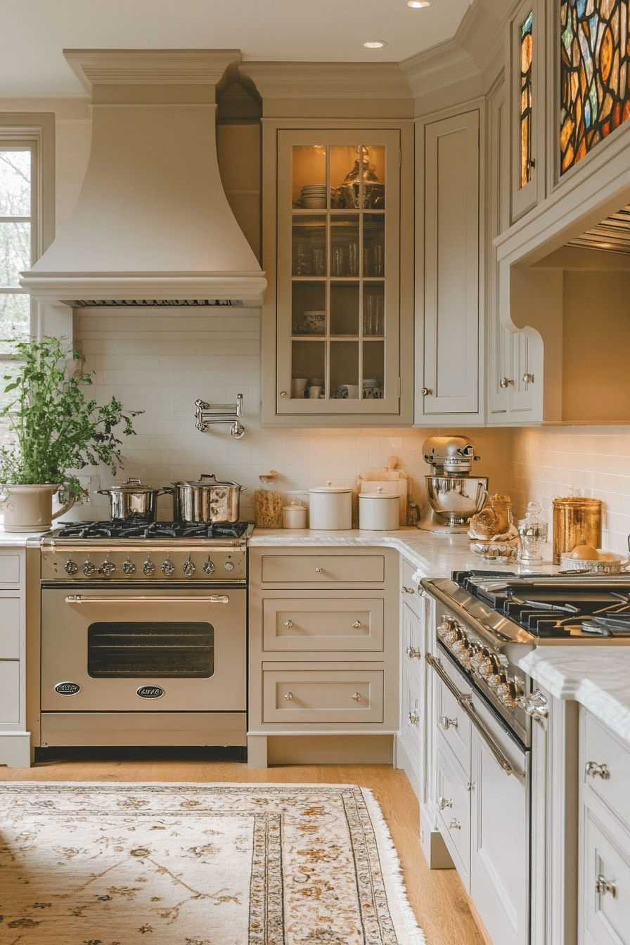 Edwardian grace brightens antique kitchen decor ideas with refined historic elegance. Glass-pane cabinets, soft pastel hues, and polished hardware keep the room light and inviting. Decorative moldings and delicate trim introduce gentle sophistication. Vintage pendant lighting and floral touches enhance the airy charm. The overall design feels balanced, polished, and comfortable. Discover antique kitchen decor ideas inspired by Edwardian interiors that make kitchens feel effortlessly elegant!