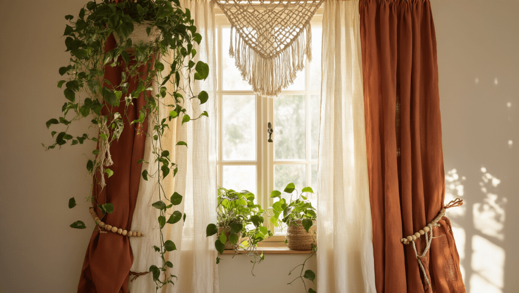 "Boho styled sunlit room with layered rust and cream curtains, macramé hangings, and hanging pothos plants"