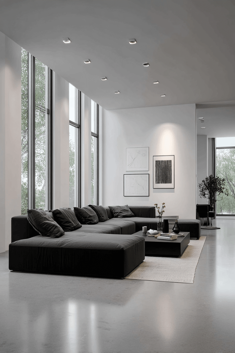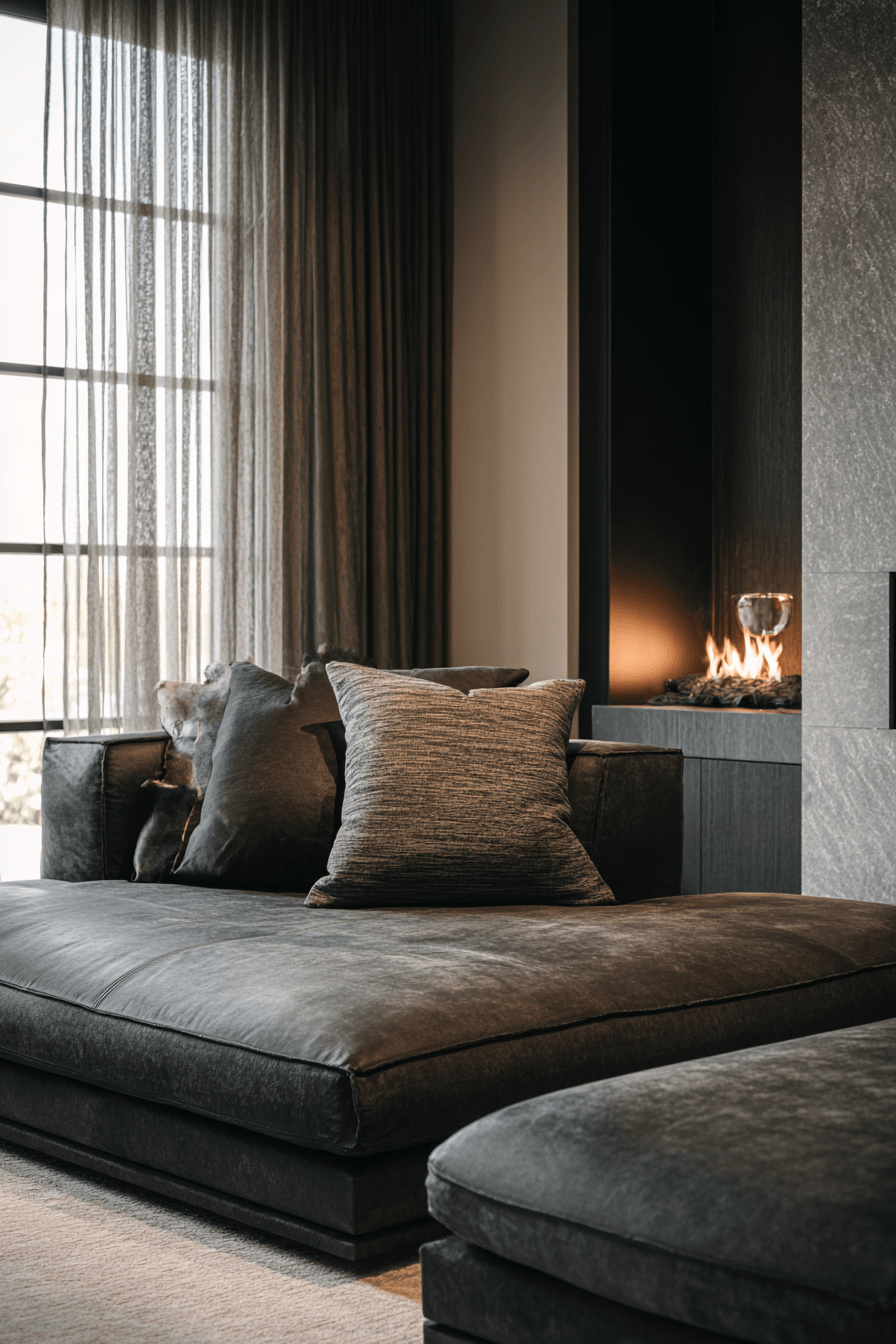 Modern architecture shines in a charcoal couch living room defined by strong contemporary lines. The charcoal sofa pairs with geometric tables and sleek furniture pieces. Minimal décor keeps the focus on structure and form. Indirect lighting highlights the room’s clean edges. This charcoal couch living room feels bold and modern. Explore more architectural living room inspiration.