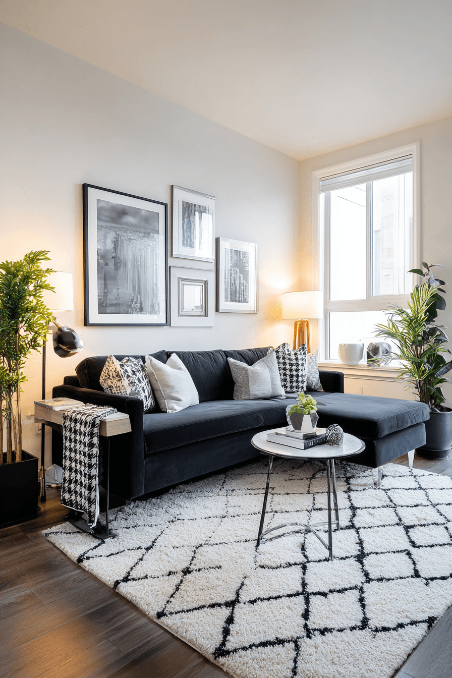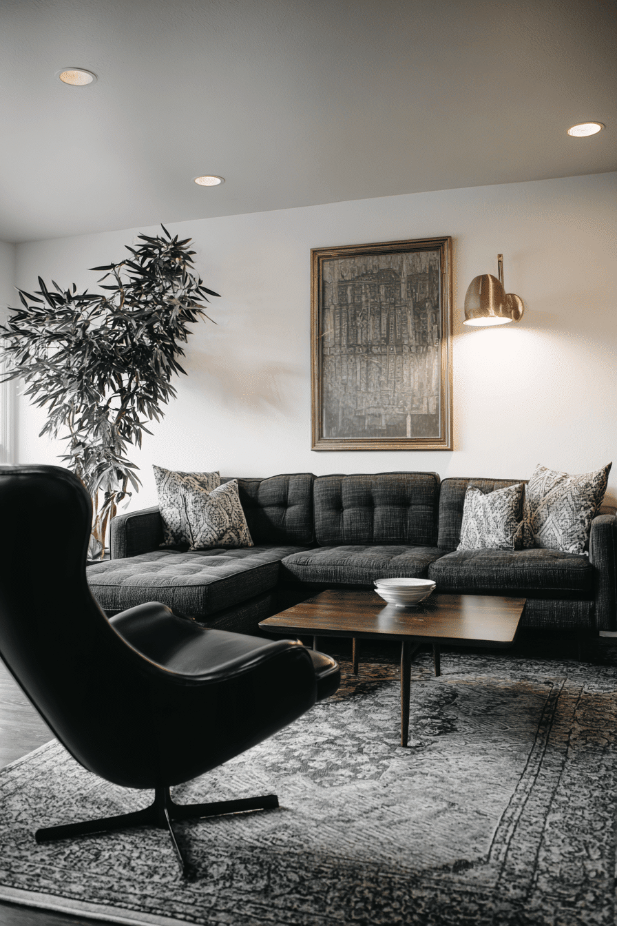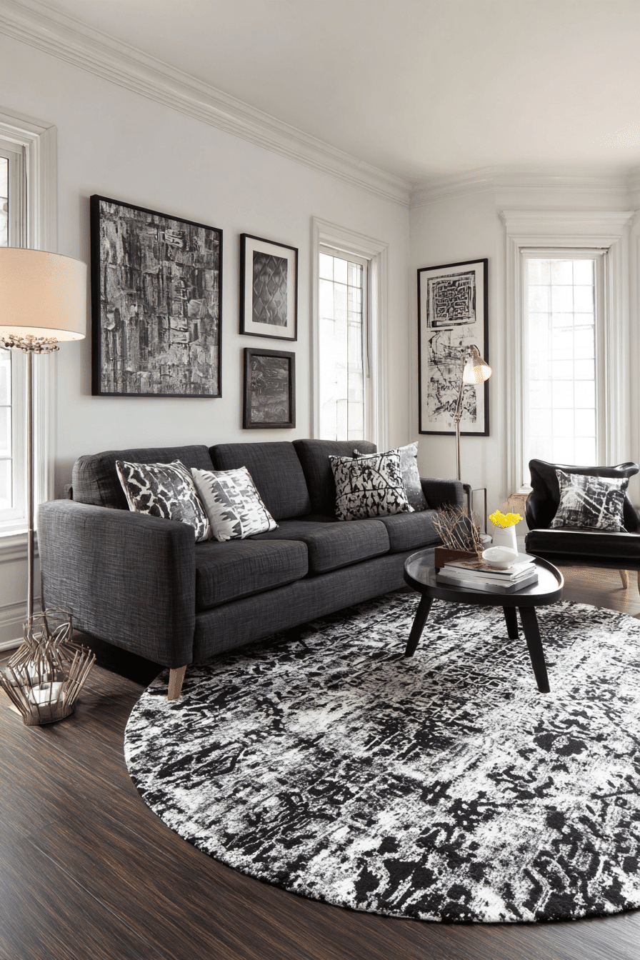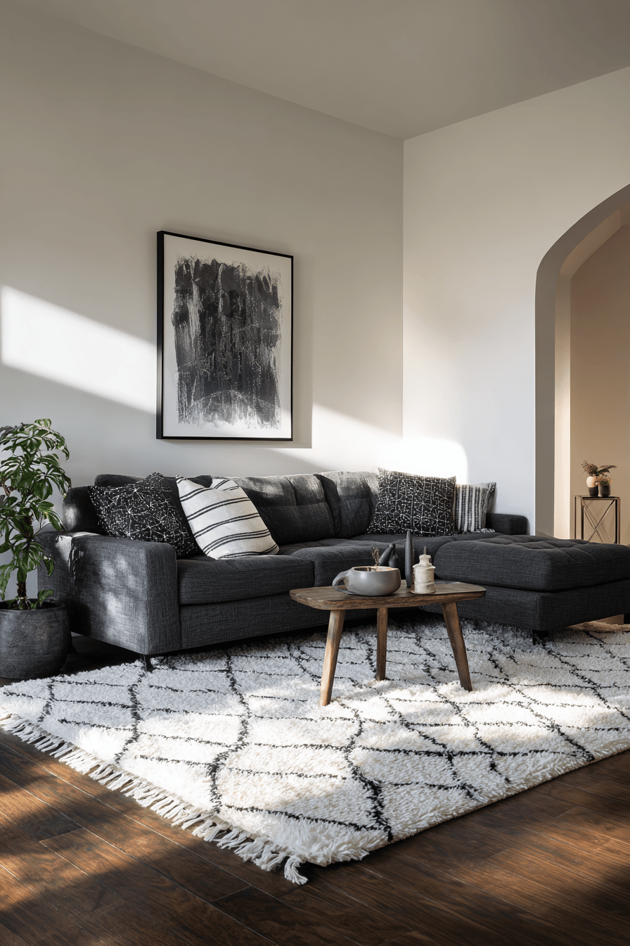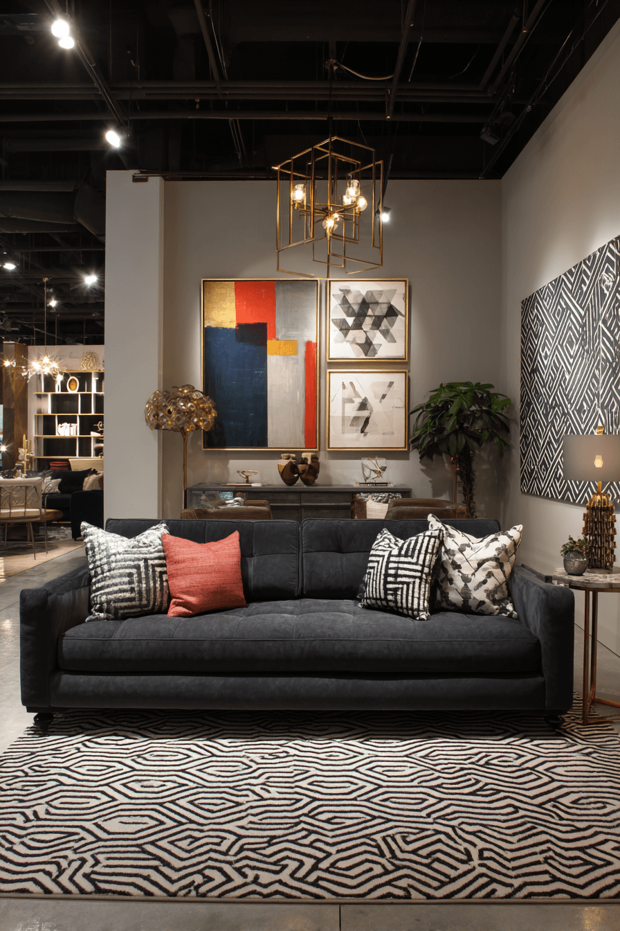 Structured patterns introduce visual rhythm to a charcoal couch living room styled with geometric accents. The charcoal sofa pairs effortlessly with patterned rugs, cushions, and wall décor. Repeating shapes and clean lines create a modern, energetic feel. A limited color palette keeps the design cohesive. Accent lighting highlights the patterns and textures throughout the space. Discover more geometric styling ideas for your charcoal couch living room.