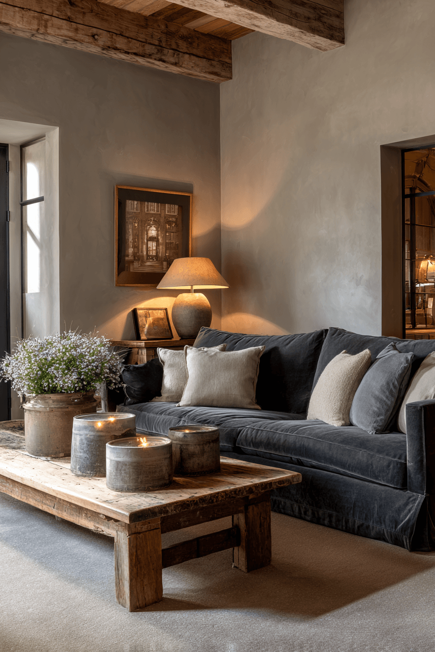 Natural textures bring warmth into a charcoal couch living room featuring rustic design influences. The charcoal sofa works beautifully with wood furniture, woven décor, and earthy tones. Soft textiles and handcrafted details create a relaxed environment. This blend of rustic charm and modern comfort makes the room feel balanced. The charcoal couch living room becomes both stylish and welcoming. Explore more rustic-modern living room inspiration.