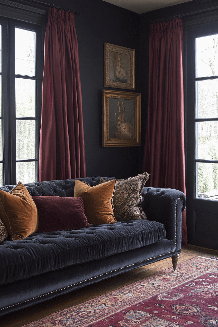 Deep dramatic hues elevate a charcoal couch living room designed with rich colors. Shades like navy, emerald, or plum enhance the presence of the charcoal sofa. Velvet fabrics and layered textures add depth and sophistication. Soft lighting introduces a cozy glow that completes the look. This bold charcoal couch living room becomes the centerpiece of the home. Discover more dramatic color ideas for your living room.