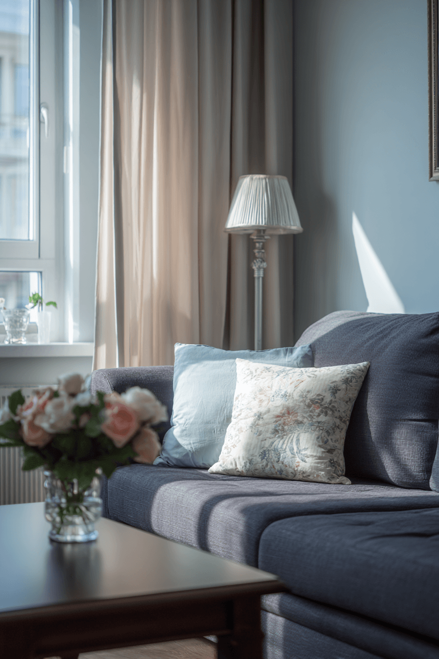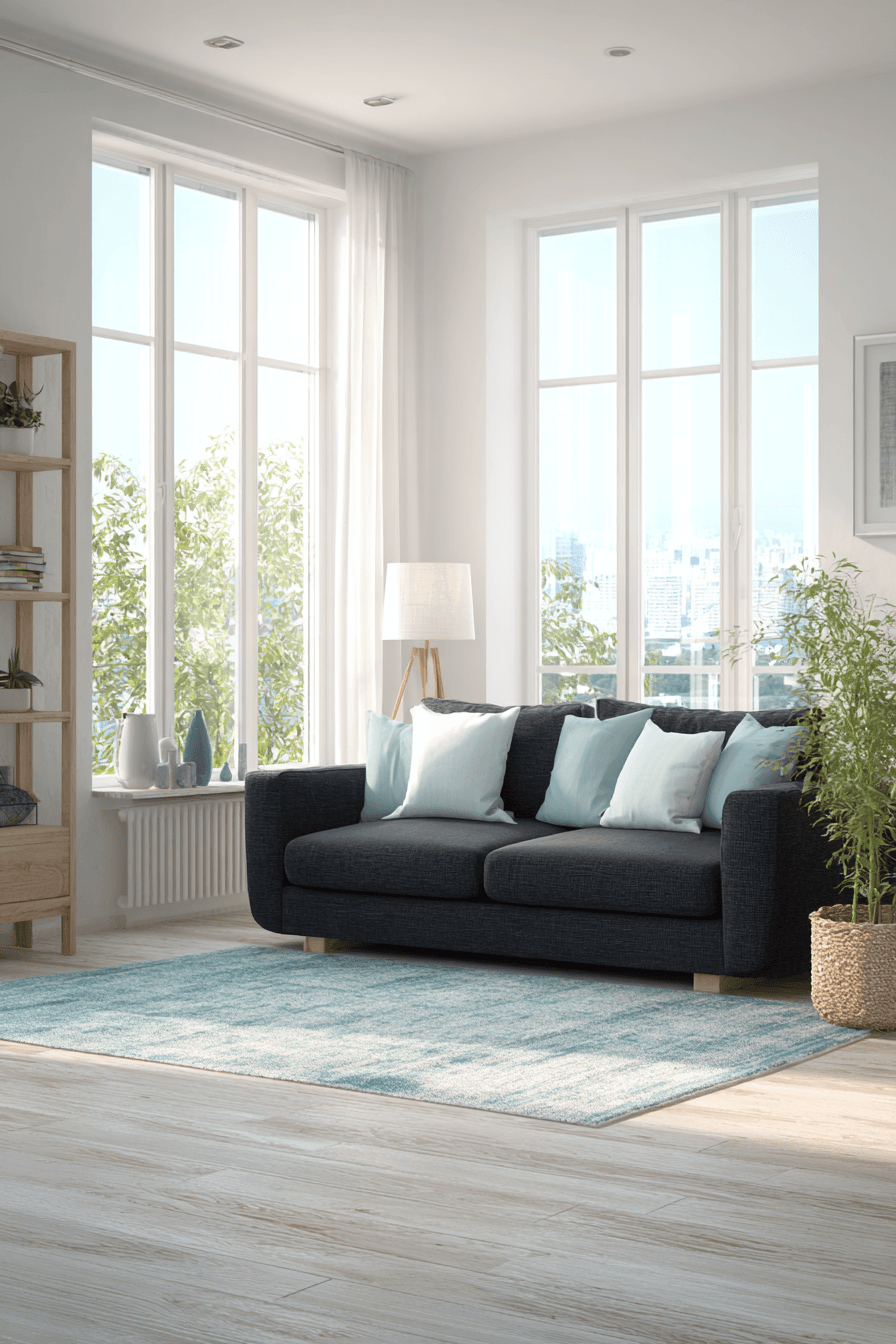 Cool calming tones shape a tranquil charcoal couch living room designed for relaxation. Soft blues, pale grays, and crisp whites create a peaceful palette around the sofa. Light flooring and sheer curtains keep the room bright and airy. Minimal décor maintains a clean and restful environment. This charcoal couch living room feels serene and refreshing. Browse calming color inspiration for your living space.