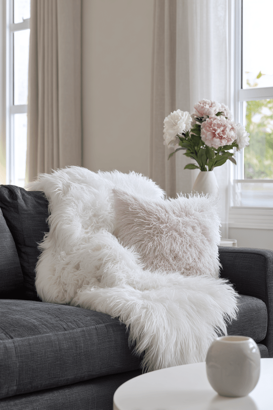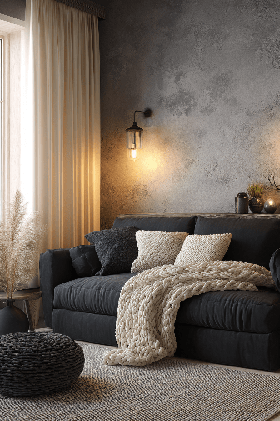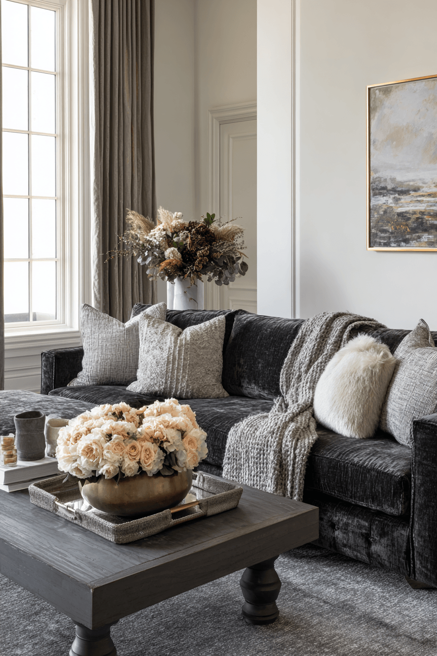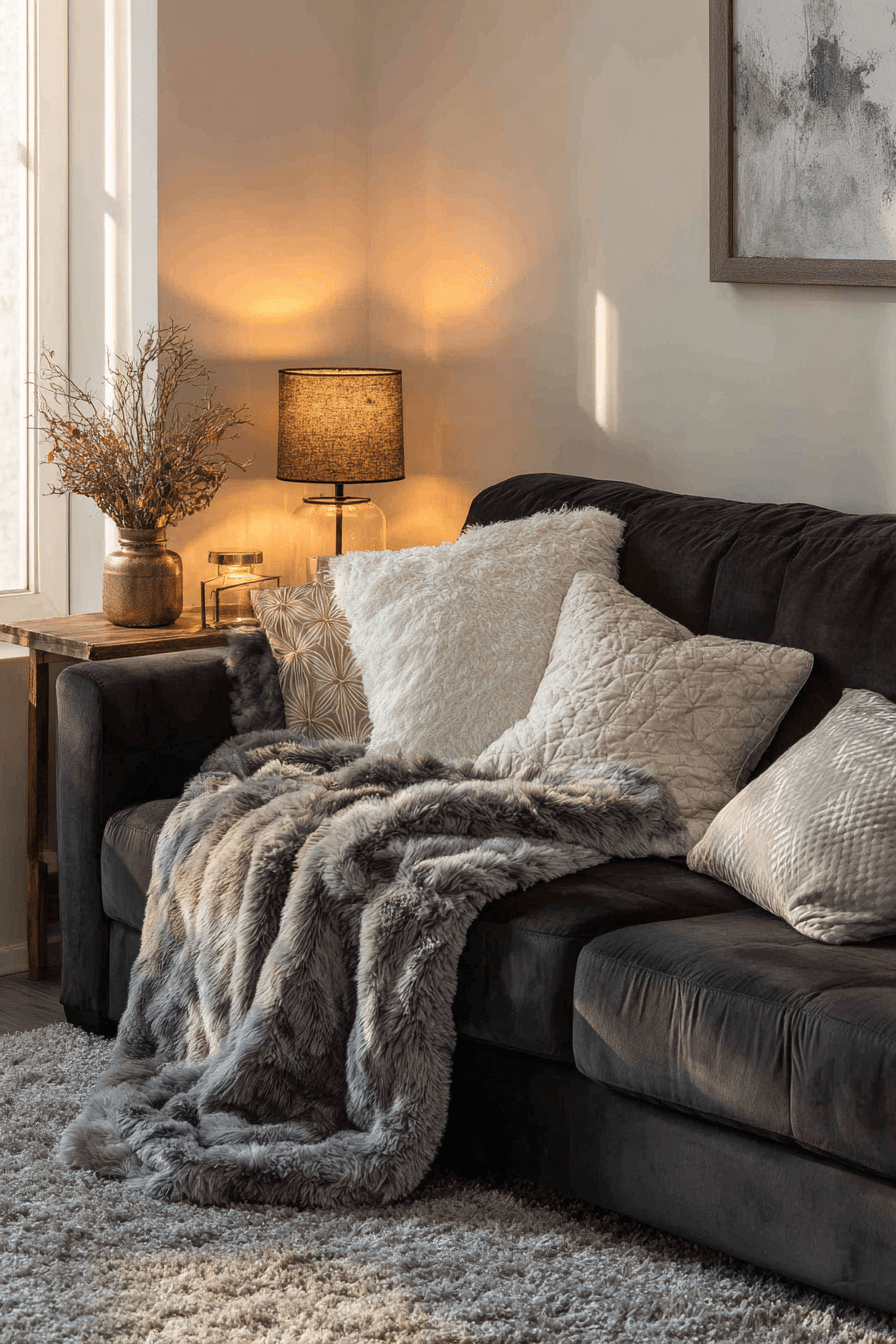 Comfort becomes the highlight of a charcoal couch living room when cozy layers surround the deep-toned sofa. Plush blankets, textured cushions, and soft rugs create a warm and welcoming retreat. The charcoal couch provides bold contrast against lighter fabrics and walls. Ambient lighting and natural materials enhance the room’s inviting vibe. This setup turns the charcoal couch living room into the perfect relaxation zone. Explore more cozy decorating inspiration for your living room today.