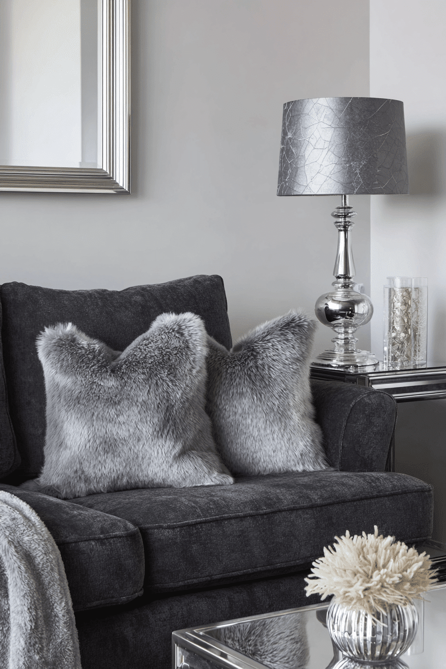 Subtle glamour appears in a charcoal couch living room where elegance meets sparkle. The charcoal sofa anchors the space while metallic accents add shine. Glass tables and chic lighting introduce sophistication. A soft neutral palette keeps everything balanced. The room feels cozy while still maintaining refined style. Explore more glam decorating ideas for your charcoal couch living room.