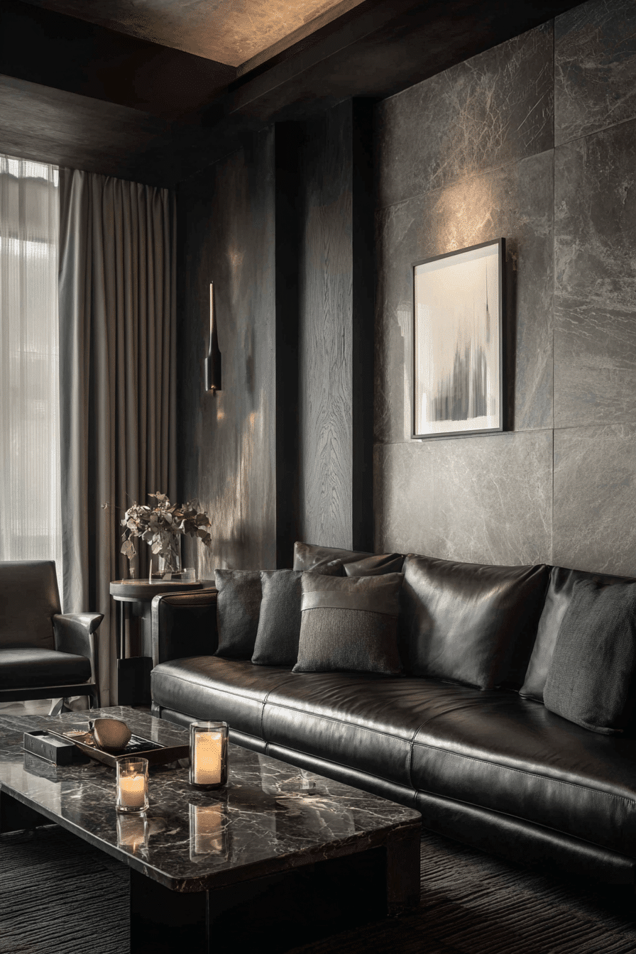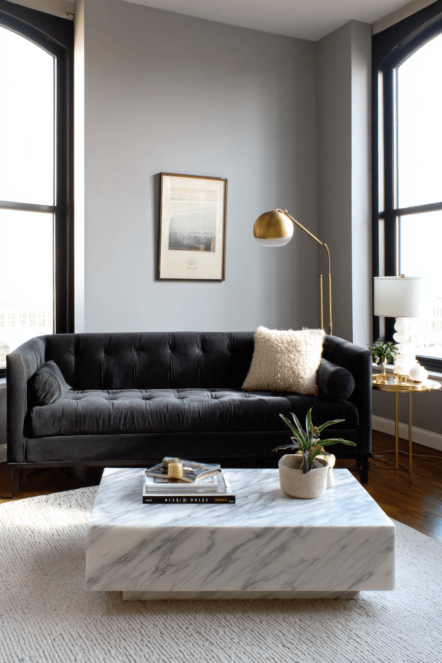 Understated elegance defines a charcoal couch living room layered with luxurious materials. The charcoal sofa pairs beautifully with marble tables, polished wood, and metallic accents. Plush rugs and soft throws enhance comfort while maintaining sophistication. Gentle lighting highlights the textures across the room. The charcoal couch living room feels upscale yet approachable. Discover more ideas that bring quiet luxury into your home.