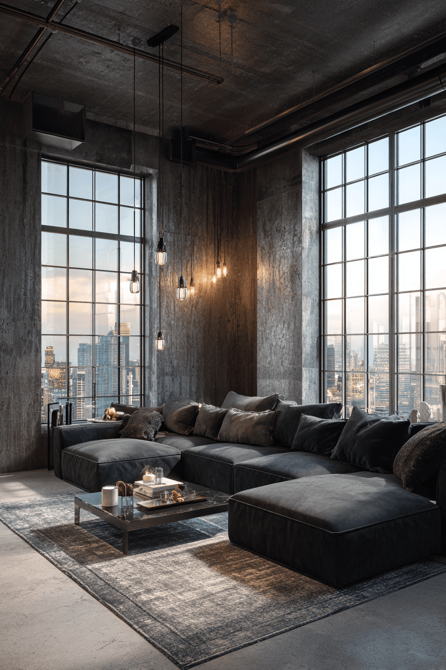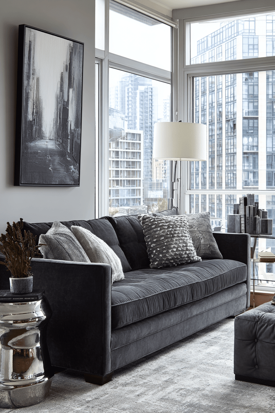 Urban inspiration shapes a charcoal couch living room filled with contemporary energy. The charcoal sofa anchors the layout while glass, steel, and minimalist décor add style. Open spaces keep the design feeling light and modern. Natural light from large windows brightens the room. Accent lighting enhances architectural features. Discover more urban living room ideas for your charcoal couch living room.