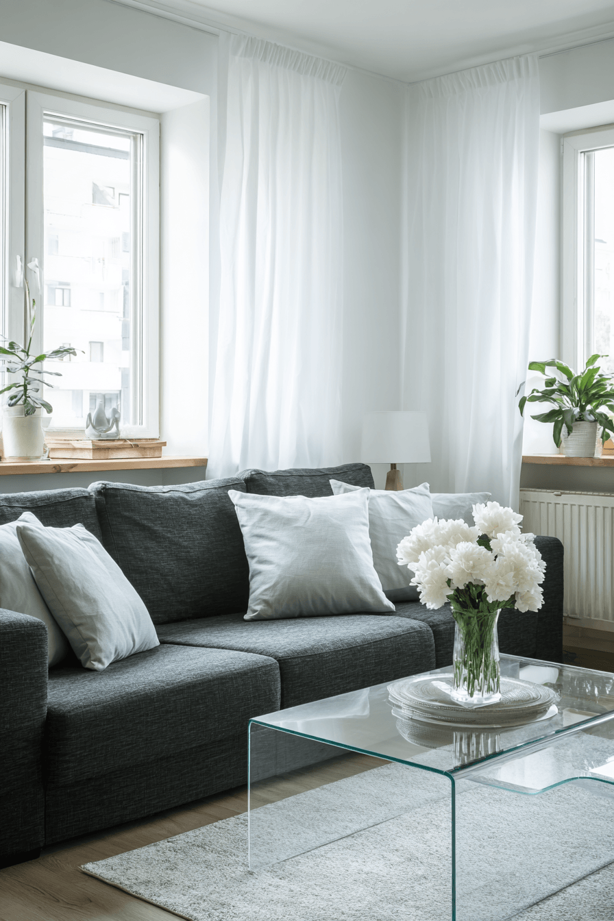 Fresh brightness fills a charcoal couch living room designed with crisp modern elements. The charcoal sofa contrasts beautifully with bright walls and light décor. Glass tables and minimal accessories keep the room open. Soft gray tones create a balanced palette. Natural light enhances the welcoming atmosphere. Discover more bright living room ideas for your charcoal couch living room.