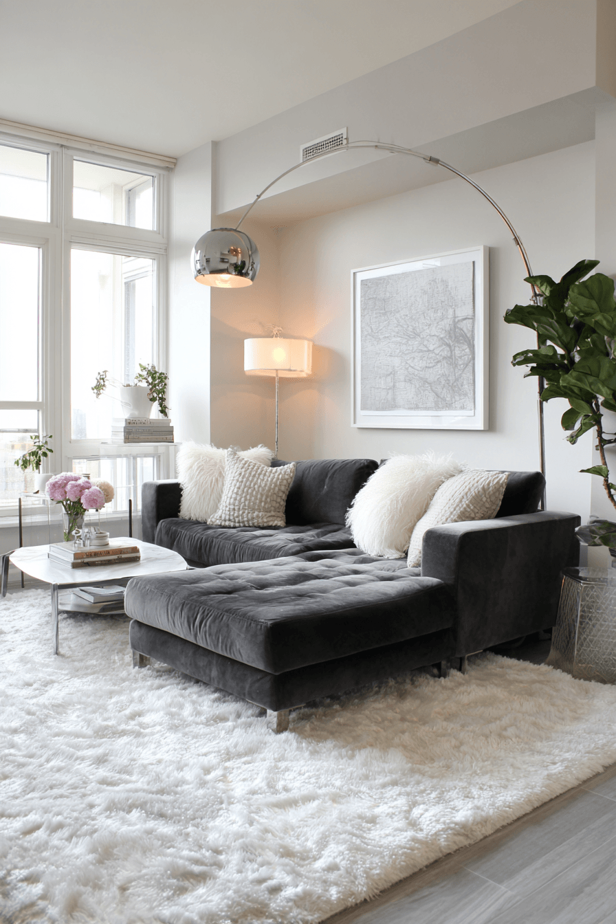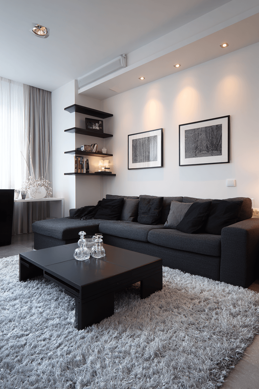 Minimal design becomes powerful in a charcoal couch living room focused on bold simplicity. The dark sofa contrasts sharply against bright white walls. Only a few statement pieces provide visual interest. Open space allows each element to feel intentional. The result is a charcoal couch living room that feels striking yet calm. Browse minimalist inspiration to refresh your space.