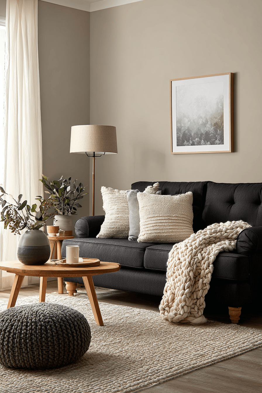 Warm neutral tones create a comforting retreat in a charcoal couch living room styled with soft color layers. Beige, cream, and taupe elements soften the bold charcoal sofa. Textured blankets, woven baskets, and plush rugs introduce depth and warmth. Ambient lighting adds to the cozy atmosphere throughout the room. The charcoal couch living room becomes a welcoming gathering space for everyone. Explore more warm neutral living room inspiration today.