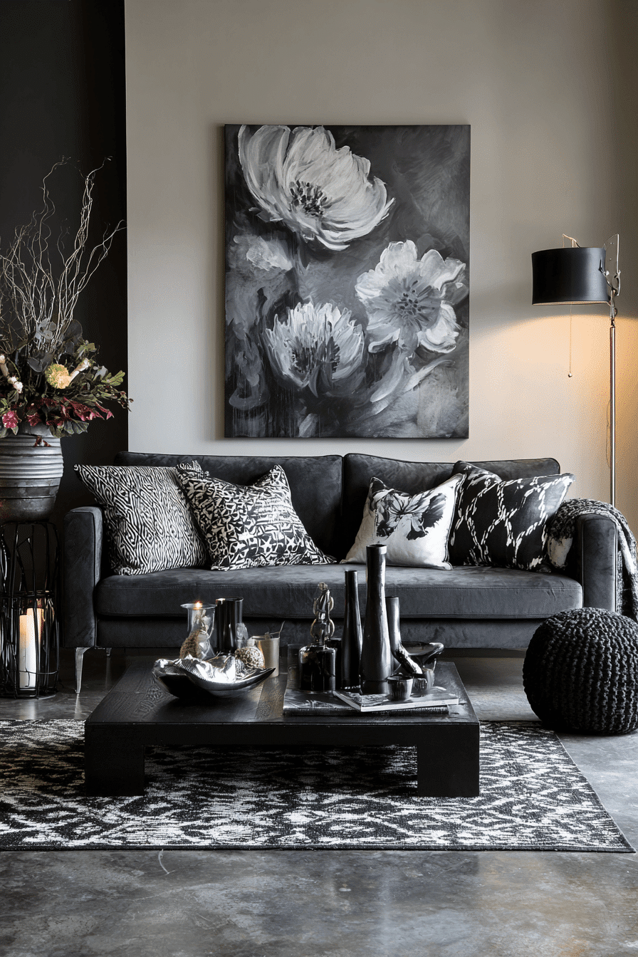 A cohesive visual story unfolds in a charcoal couch living room designed with a monochromatic color palette. Layers of gray, black, and white surround the charcoal sofa to create a unified design. Soft textiles balance smooth surfaces for added dimension. Minimal accessories allow the palette to remain clean and elegant. The result is a charcoal couch living room that feels effortlessly modern. Tap to explore more monochrome living room inspiration.