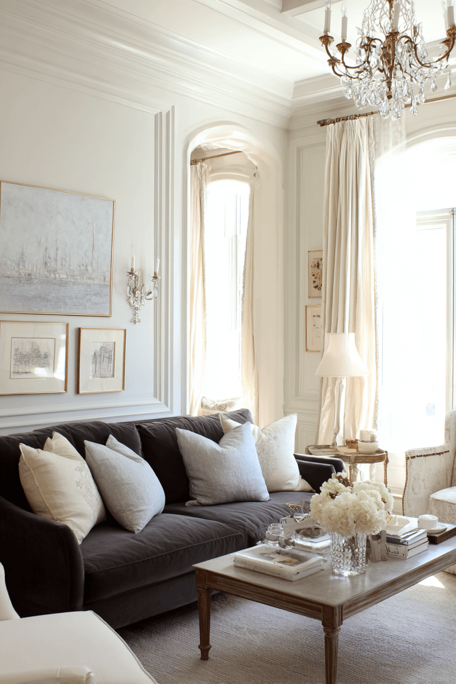Elegant restraint defines a charcoal couch living room designed with subtle luxury. The charcoal sofa pairs with delicate metallic accents and soft neutral tones. Carefully chosen décor pieces maintain a refined appearance without overwhelming the room. Warm lighting gently highlights textures and surfaces. The result is a charcoal couch living room that feels polished and welcoming. Discover more elegant decorating ideas to elevate your living space.