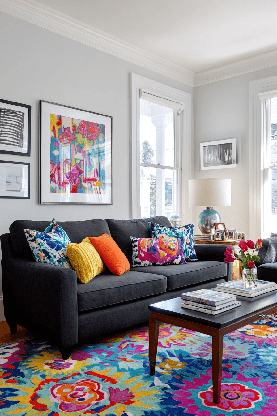 Bold personality emerges in a charcoal couch living room accented with vibrant colors. Bright pillows, colorful rugs, and striking artwork stand out against the charcoal sofa. The dark couch balances the palette so the bold accents feel intentional. High contrast details energize the design without overwhelming it. This lively charcoal couch living room feels full of energy and creativity. Find more bold decorating ideas to transform your living space.