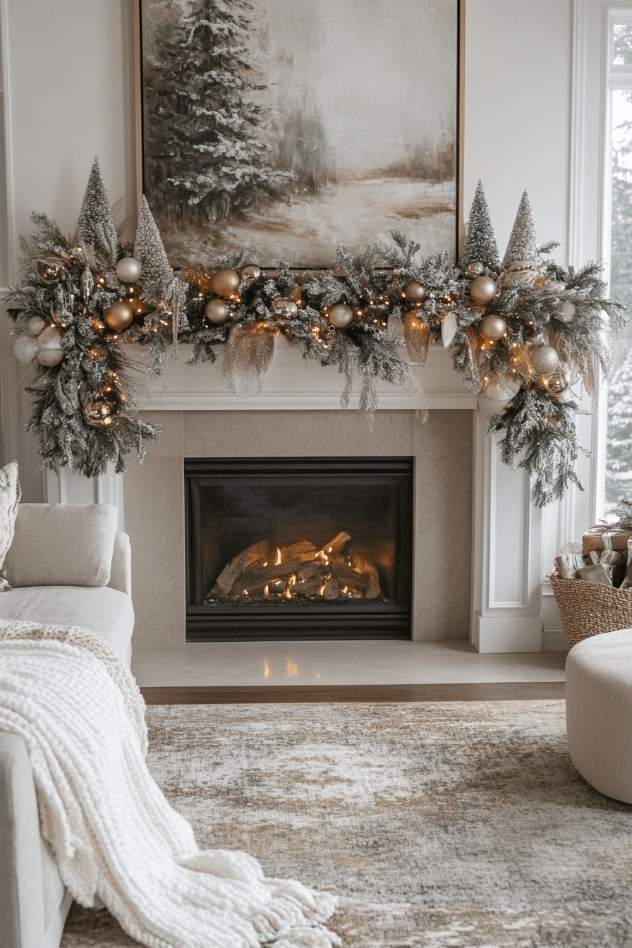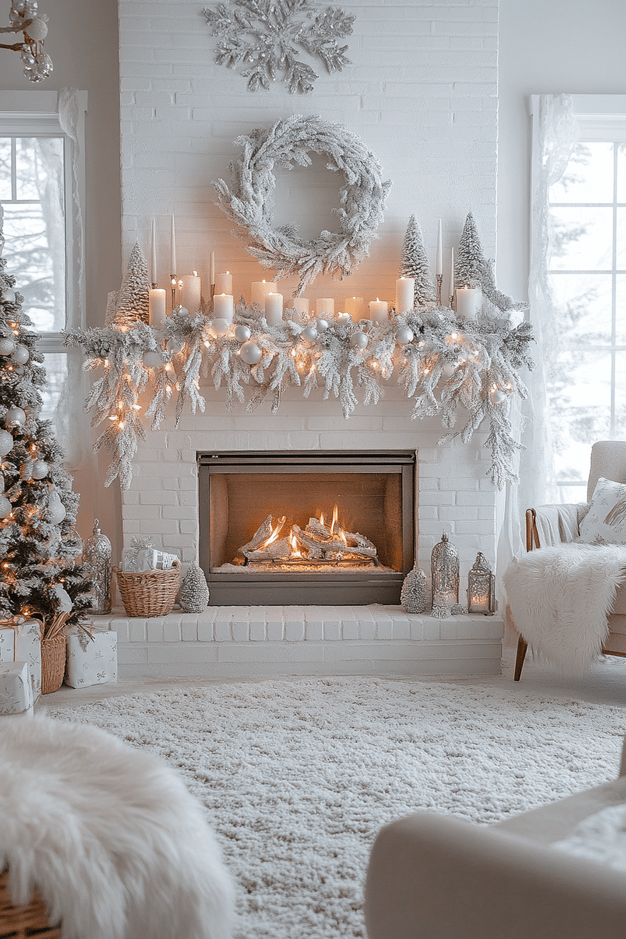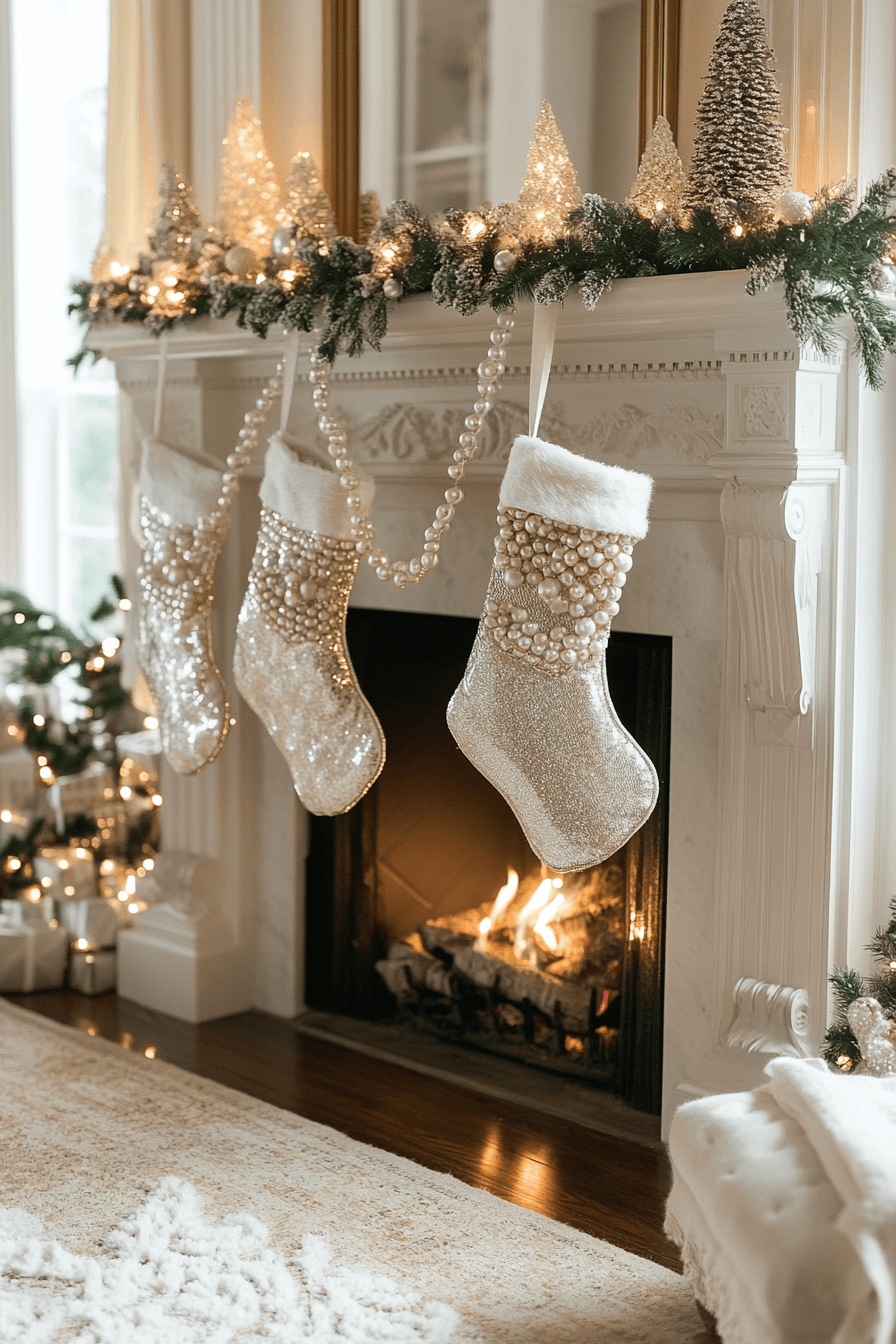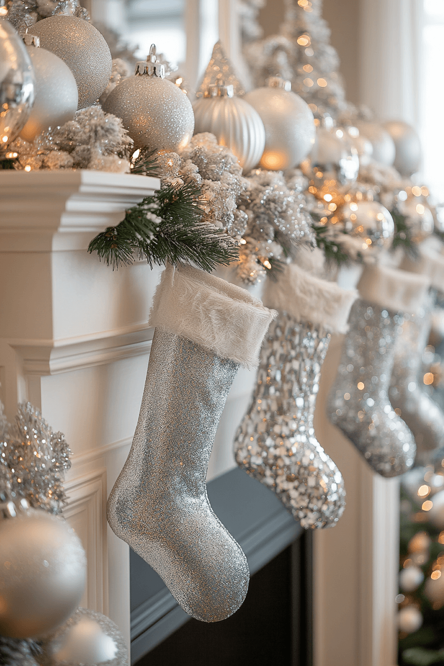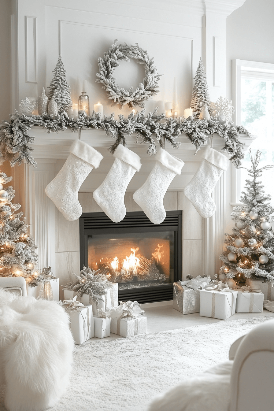 Soft whites and gentle silver tones create a peaceful glow around your hearth. Fluffy stockings and frosted garlands bring a calm wintery charm that feels comforting and serene. Subtle shimmer adds just enough sparkle without overwhelming the space. The entire arrangement feels balanced, elegant, and quietly magical.