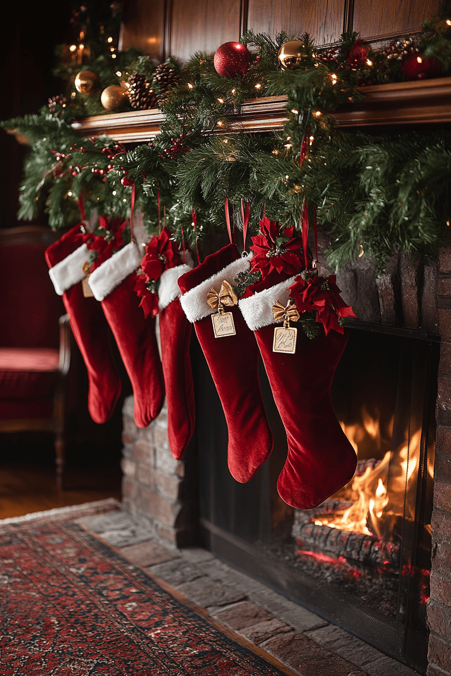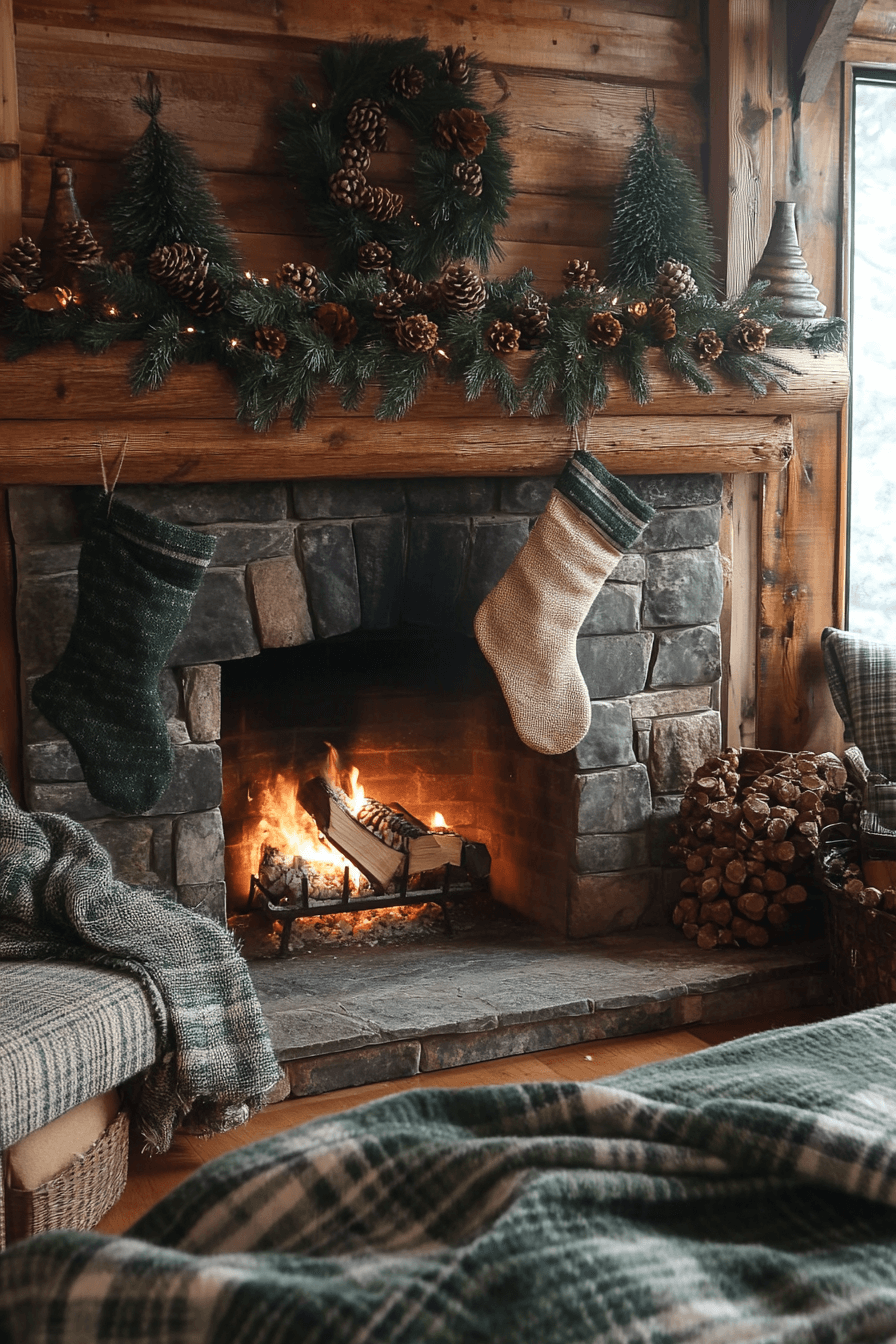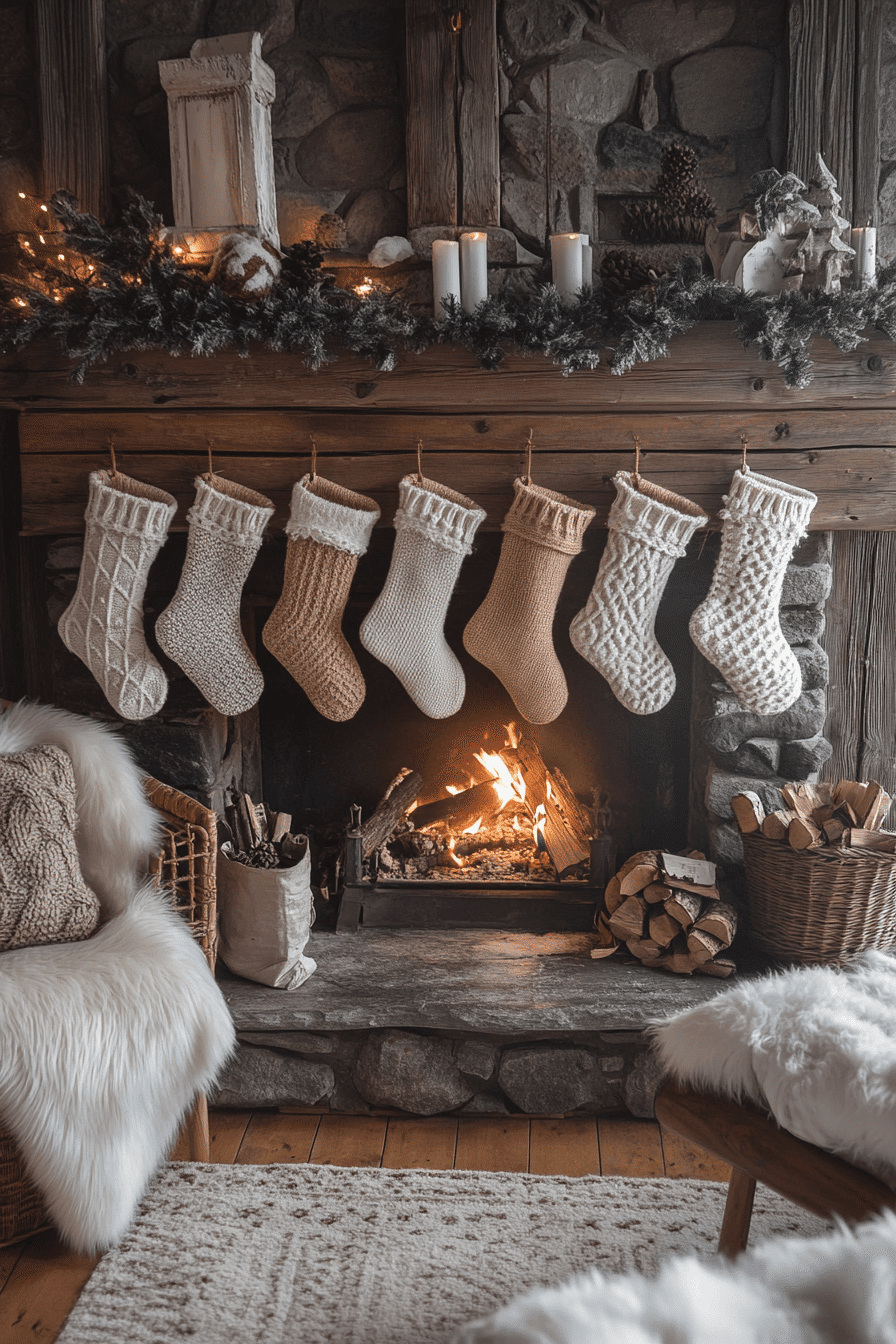 Knit stockings add layers of comfort that instantly warm up the fireplace area. Subtle textures and soft fabrics make the mantel feel welcoming and lived-in. Gentle candlelight elevates the cozy atmosphere even further. The entire setup feels like a comforting hug during the holiday season.