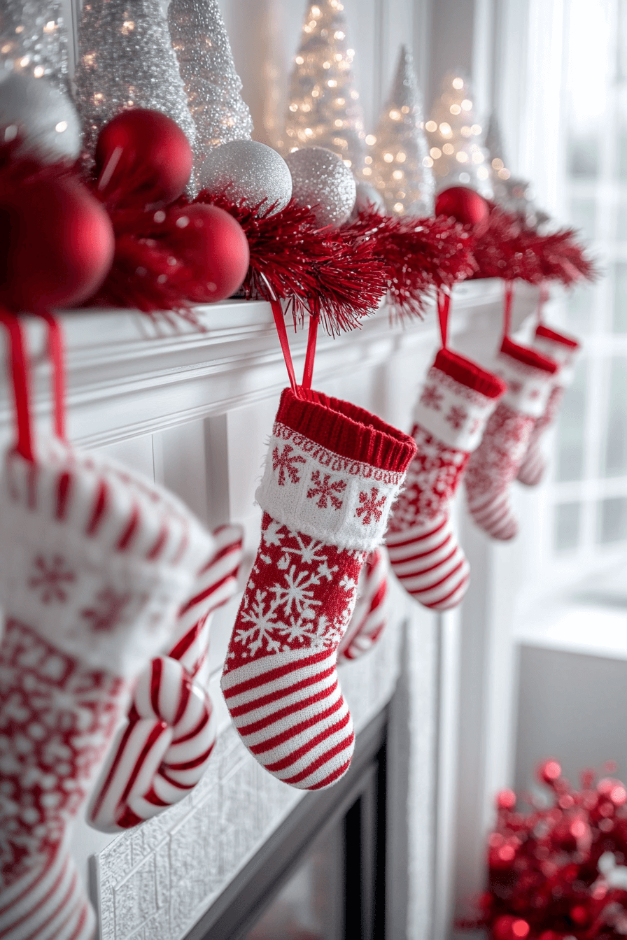 Bright stripes and festive patterns bring youthful joy to your mantel. Red and white details feel nostalgic while still keeping the space fresh. Greenery adds balance and ties the look together effortlessly. The entire setup feels spirited and fun.