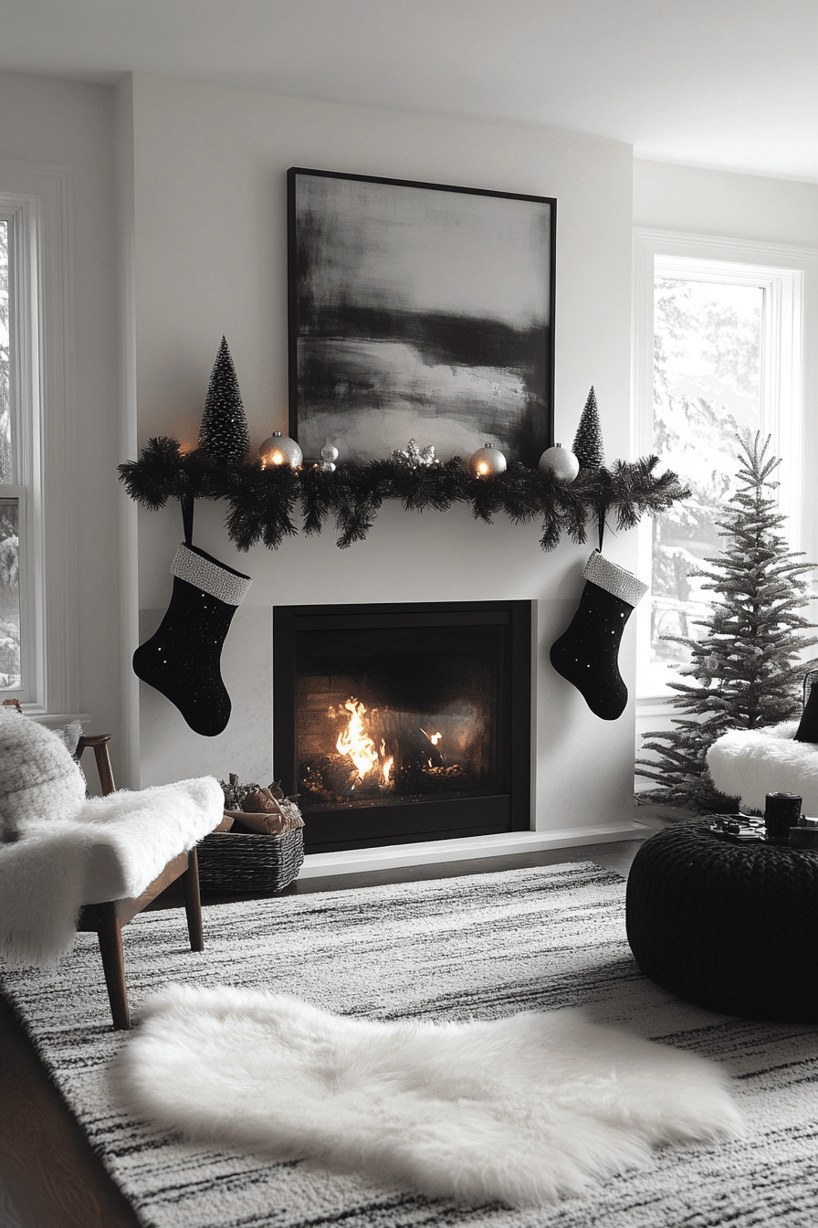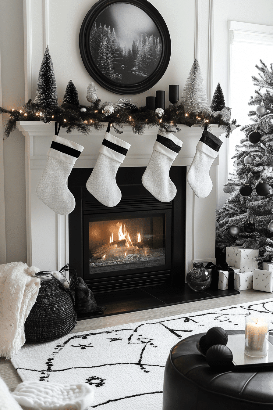 Strong contrasts and modern silhouettes add instant impact to your fireplace display. Clean shapes keep the look sharp while still feeling seasonal. Simple garlands soften the bold lines without losing style. The balance creates a visually striking holiday arrangement.