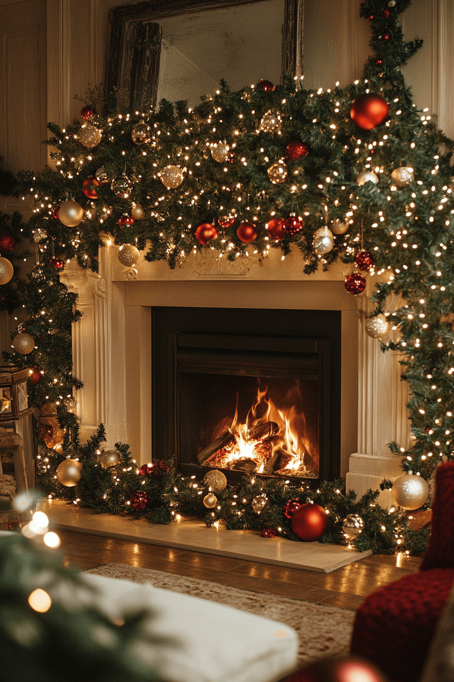Twinkling string lights instantly turn your fireplace into a glowing holiday centerpiece. Soft illumination adds warmth that makes every detail feel magical. Layered lighting creates depth and dimension across your mantel. The ambiance is dreamy and welcoming.