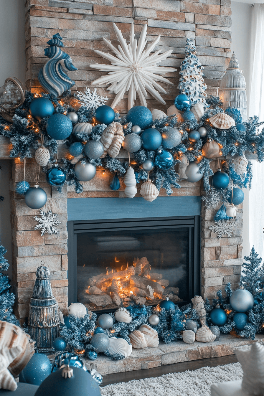 Coastal-inspired accents bring breezy, seaside charm to your fireplace setup. Soft blues and sandy beige tones create a relaxed holiday look. Driftwood textures and gentle lighting complete the coastal vibe. The space feels refreshing, calming, and delightfully festive.