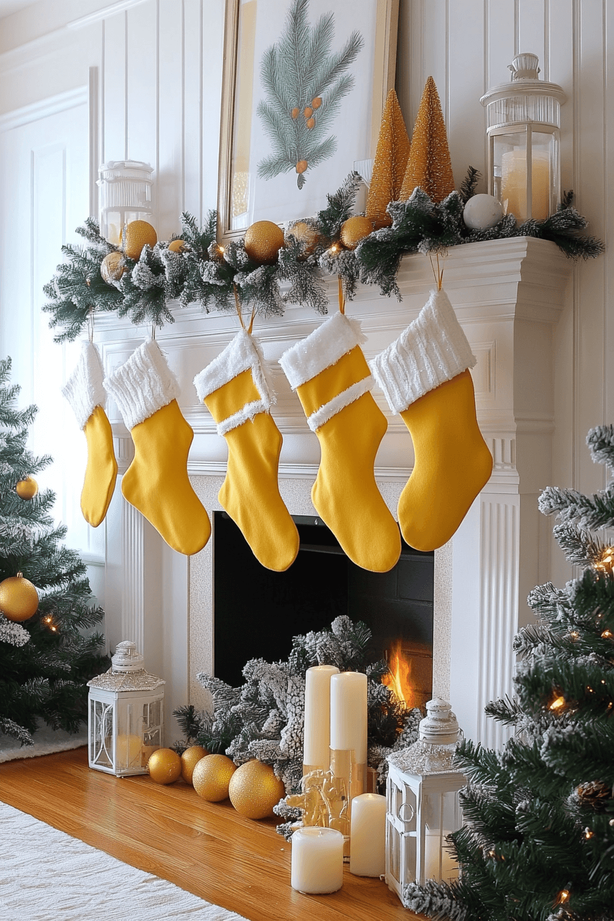 Yellow and white details brighten your hearth with cheerful seasonal energy. Soft lighting enhances the sunny palette for a joyful holiday glow. Clean stockings and crisp garlands give the look balance. The final result feels uplifting, bright, and refreshing.