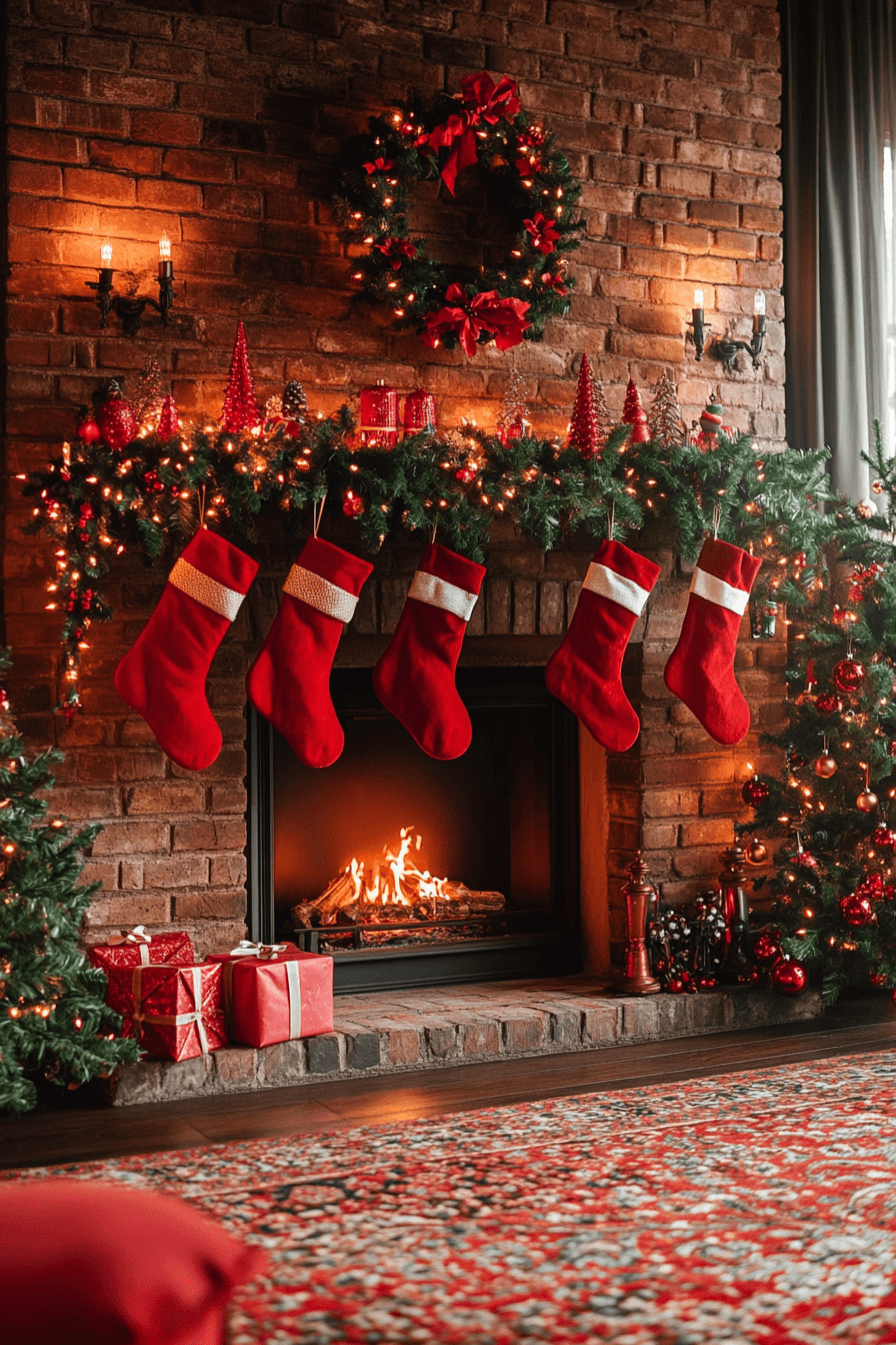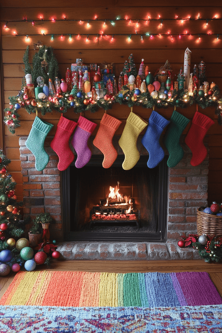 Bright reds and fresh greens instantly energize your fireplace display with traditional charm. Festive stockings and lively garlands turn the hearth into a cheerful focal point. Pops of color bring a joyful sense of nostalgia to the room. Every detail enhances the warmth and familiarity of the season.