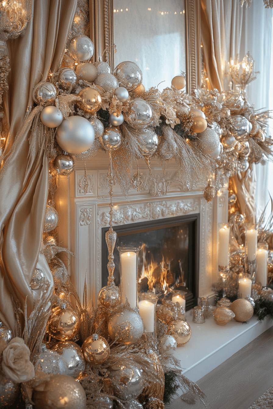 Shimmering metallics elevate your fireplace with bold seasonal glamour. Gold, silver, and champagne tones reflect beautifully off the firelight, creating a radiant holiday scene. Luxurious stockings and glossy ornaments give the display high-end appeal. The whole arrangement feels celebratory and dramatic in the best way.