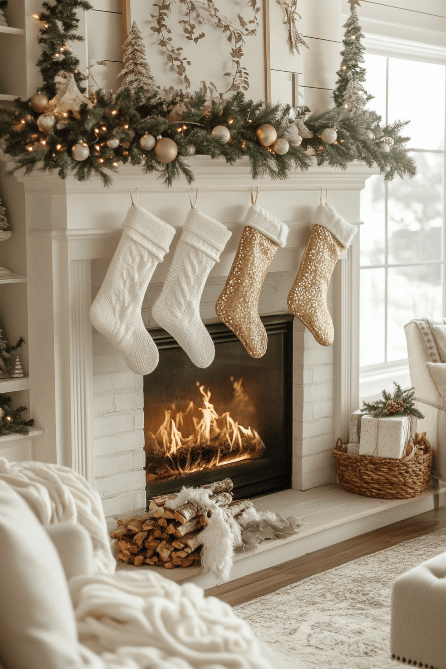 Clean white and gold elements bring calm sophistication to your fireplace design. Simple stockings and streamlined garlands create a polished foundation. Metallic accents add warmth that balances the crisp palette. The final look feels modern, minimal, and delightfully serene.