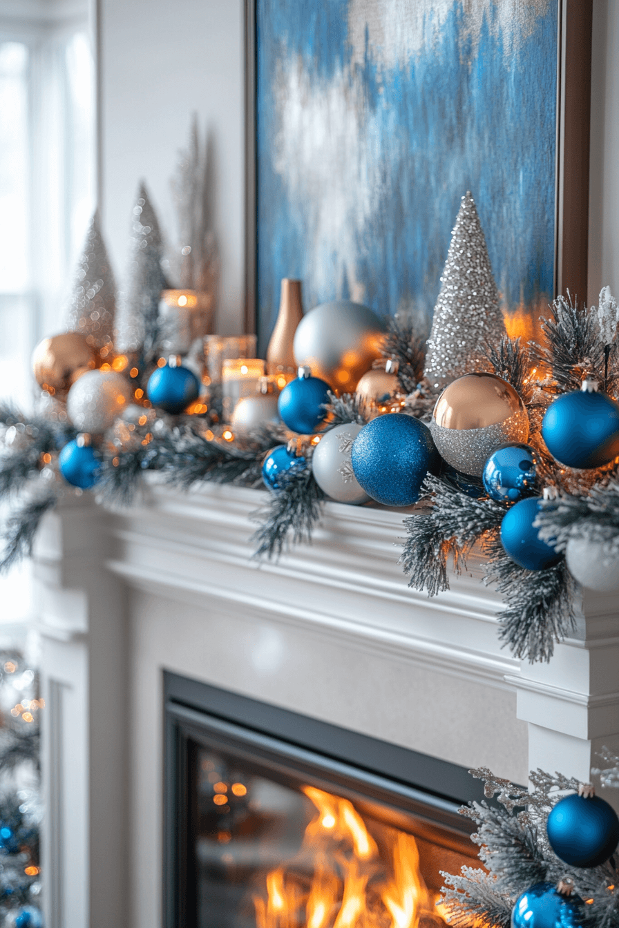 Silver details and frosty textures make your fireplace shimmer with sleek winter elegance. Soft blues complement the cool metallic tones for a polished finish. The reflective surfaces magnify firelight beautifully. The entire display feels sophisticated and serene.