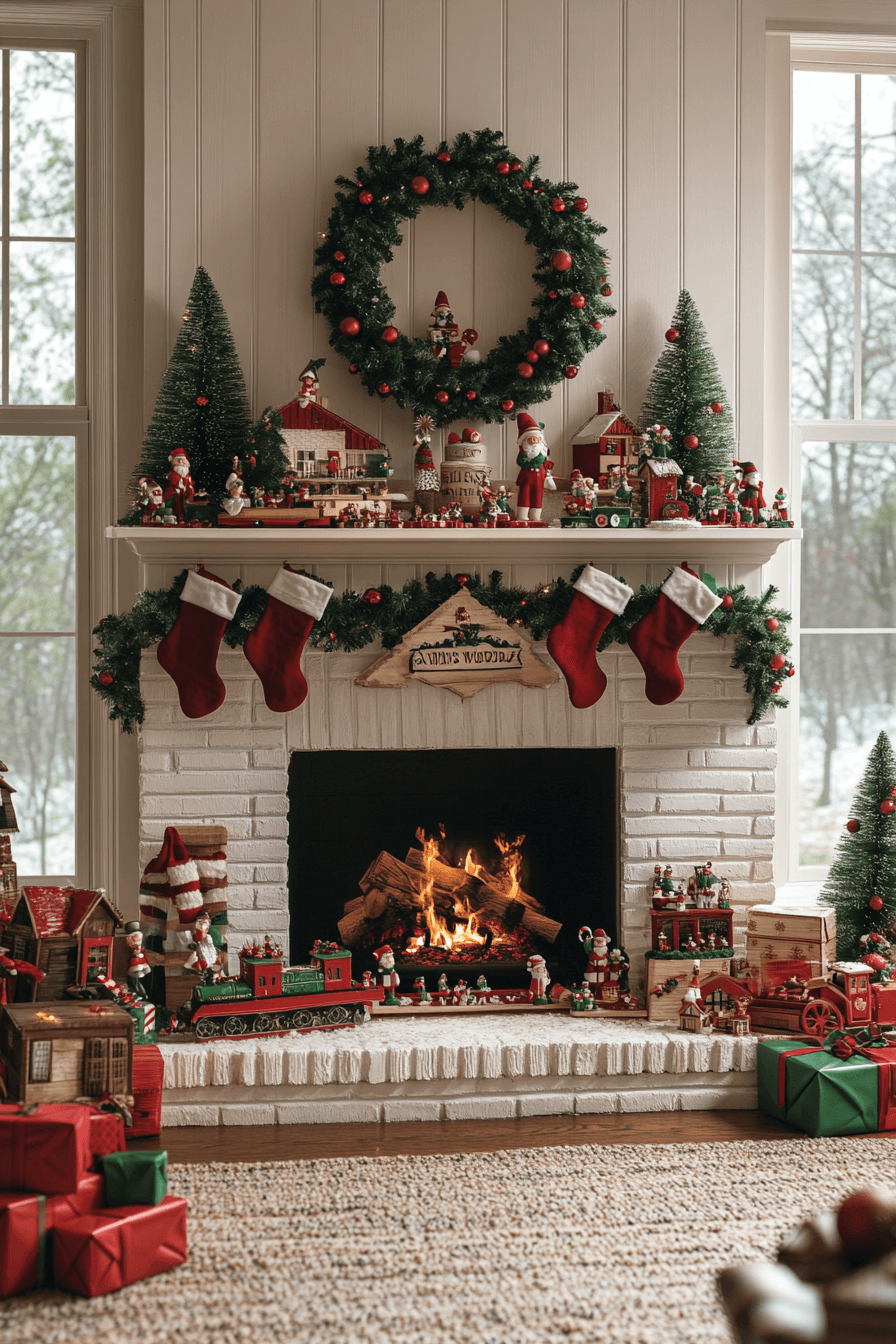 Playful holiday touches bring a delightfully whimsical spirit to your fireplace. Elf stockings, miniature gifts, and bright pops of color create joyful visual interest. Garland sprinkled with tiny surprises completes the lighthearted vibe. Every piece adds a sense of fun and imagination.