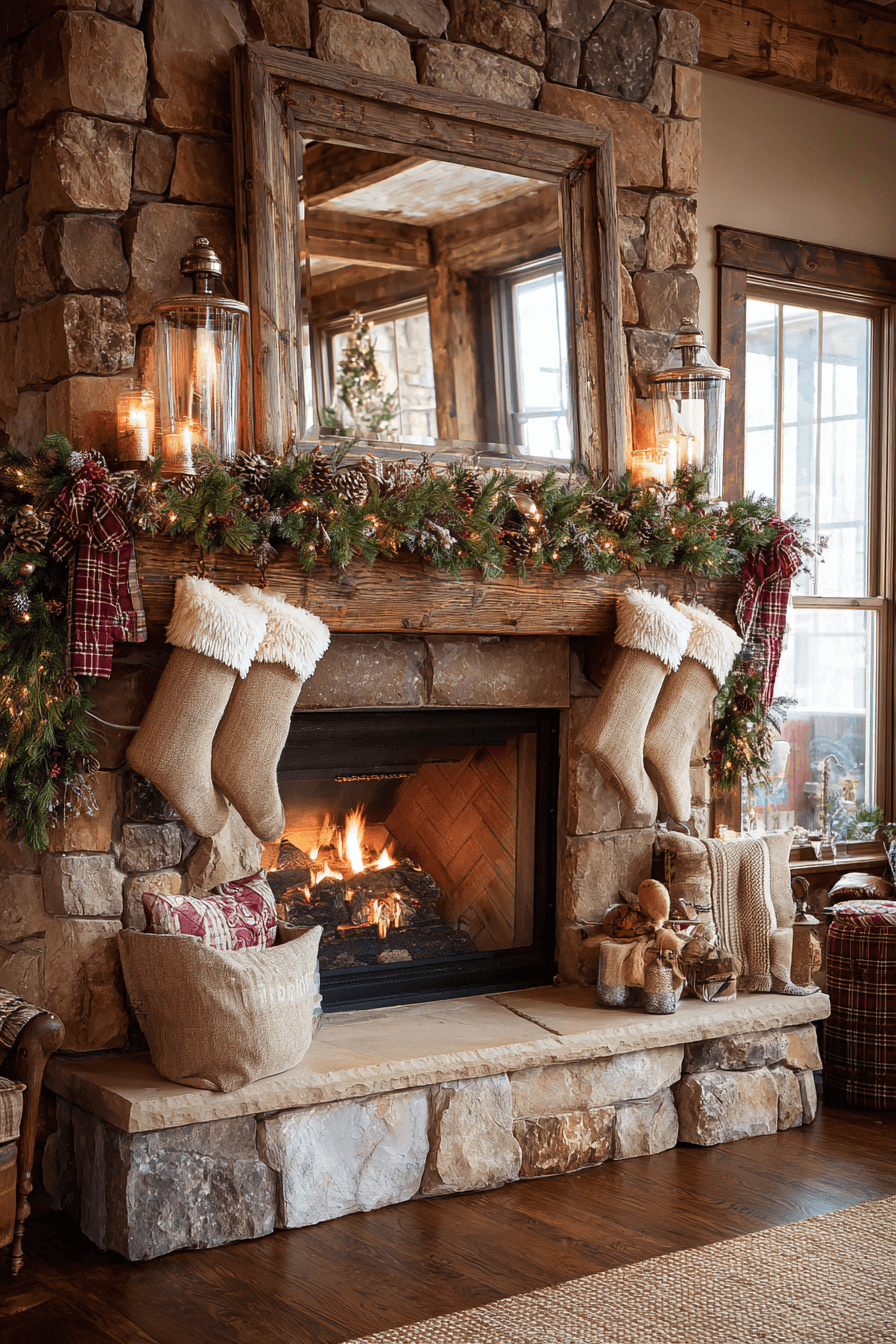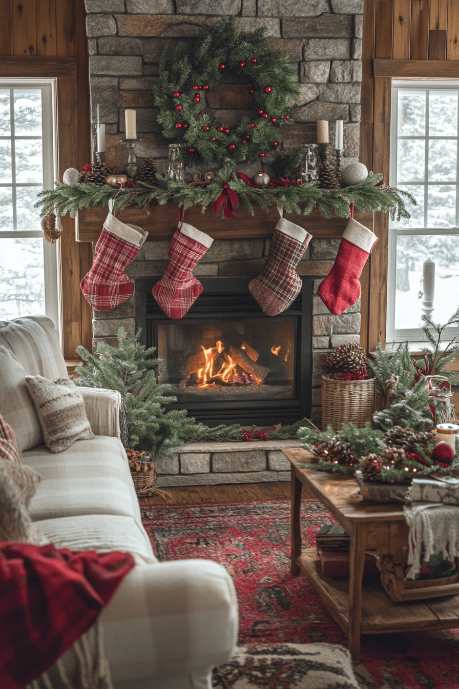 Start creating a cozy cabin vibe with christmas mantel decor that uses knit stockings, wood textures, and soft candlelit accents. Buffalo plaid details and natural garlands enrich the warm, comforting atmosphere. Each element invites relaxation and quiet evenings spent enjoying the glow of the season. The setup feels like a mountain getaway right in your living room.