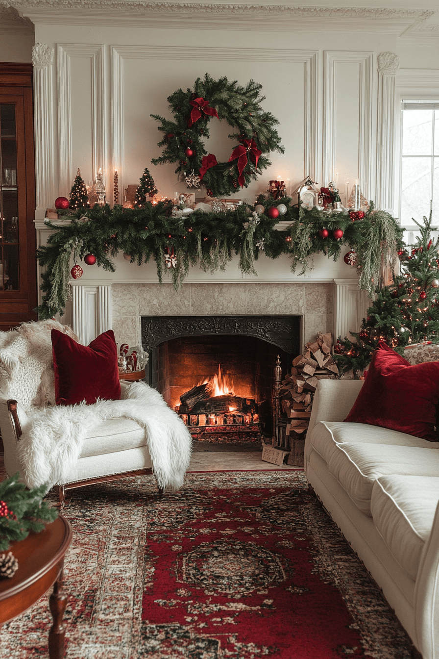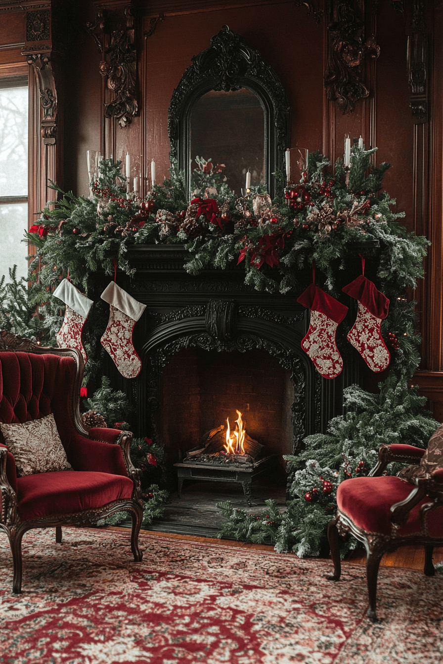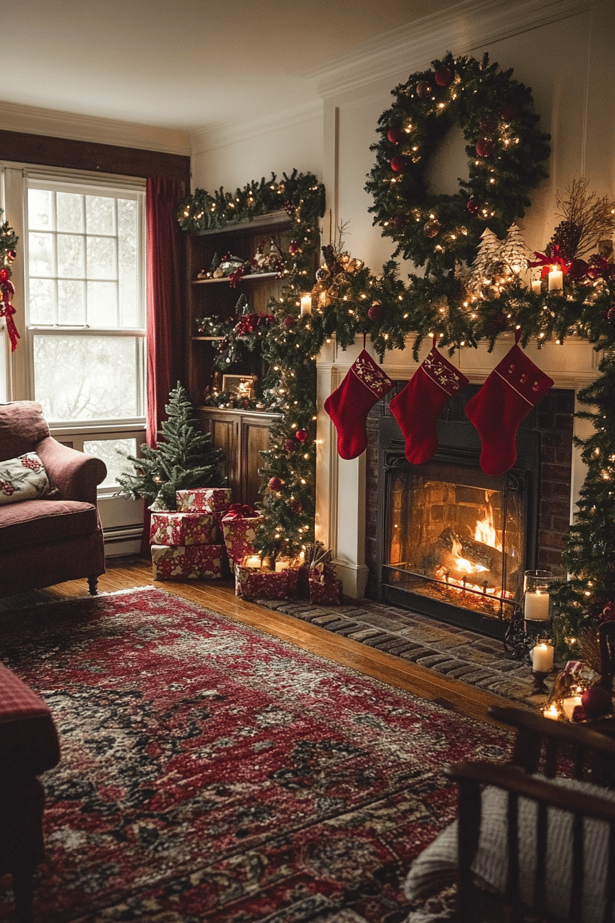 Enhance your living room with christmas mantel decor inspired by Victorian elegance using deep reds, opulent greens, and refined golds. Antique-style touches elevate the historic charm. Candlelit accents add sophistication and soft romance. The entire display feels luxurious and beautifully dramatic.