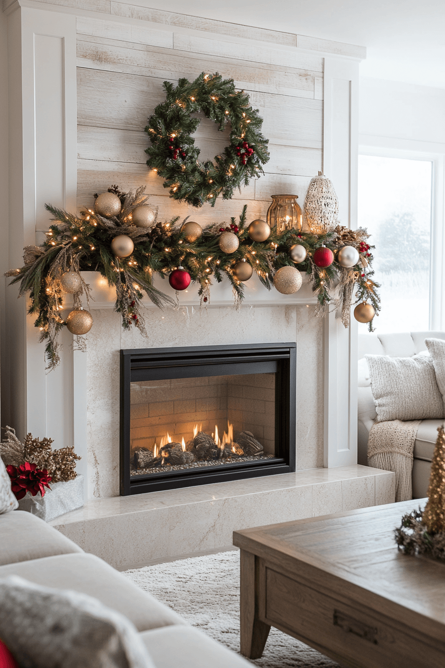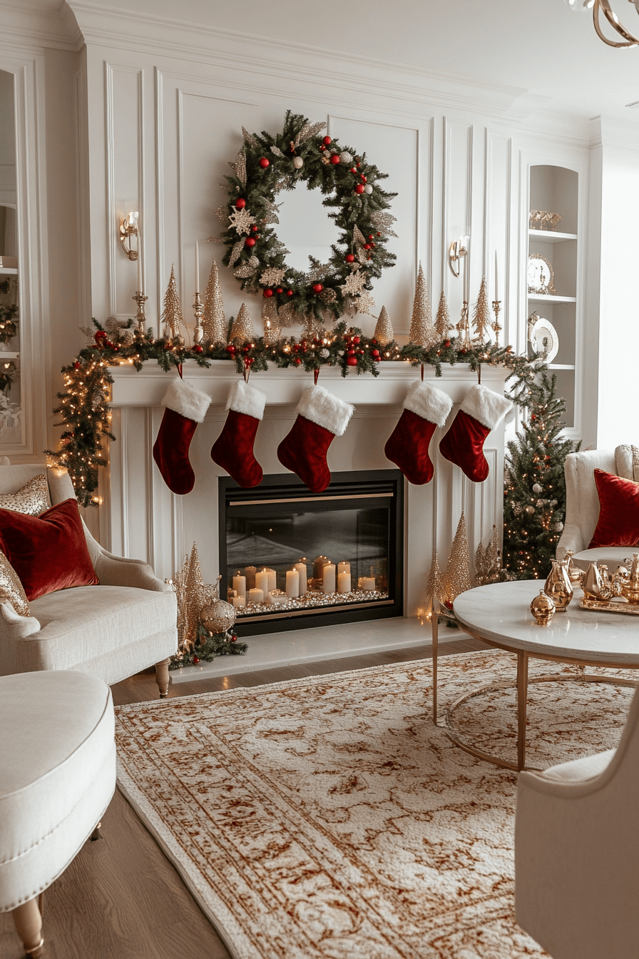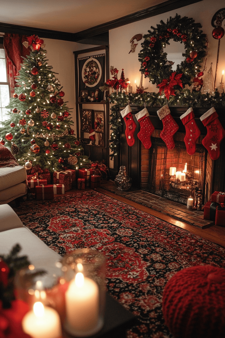 Enhance your living room with christmas mantel decor inspired by Victorian elegance using deep reds, opulent greens, and refined golds. Antique-style touches elevate the historic charm. Candlelit accents add sophistication and soft romance. The entire display feels luxurious and beautifully dramatic.